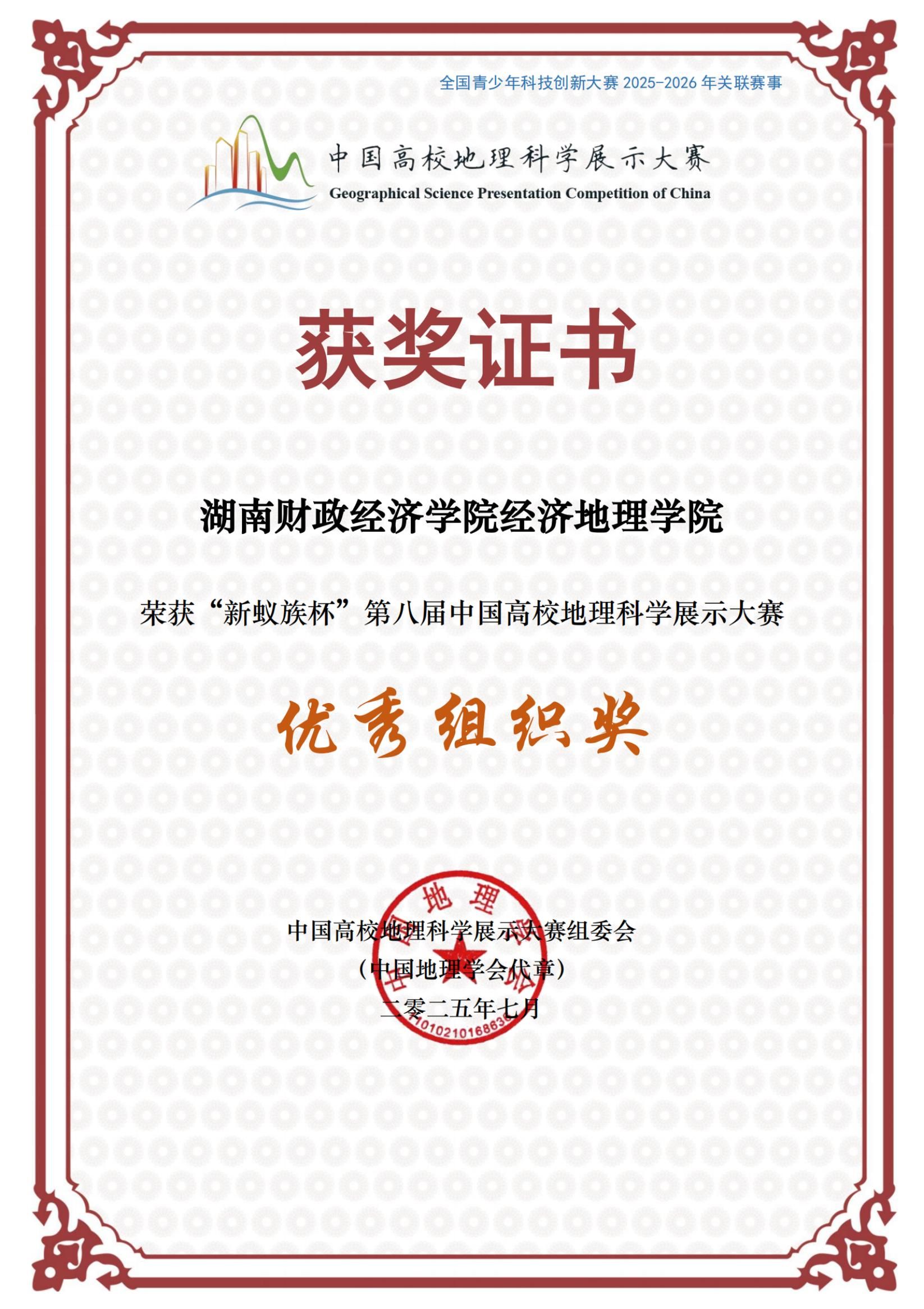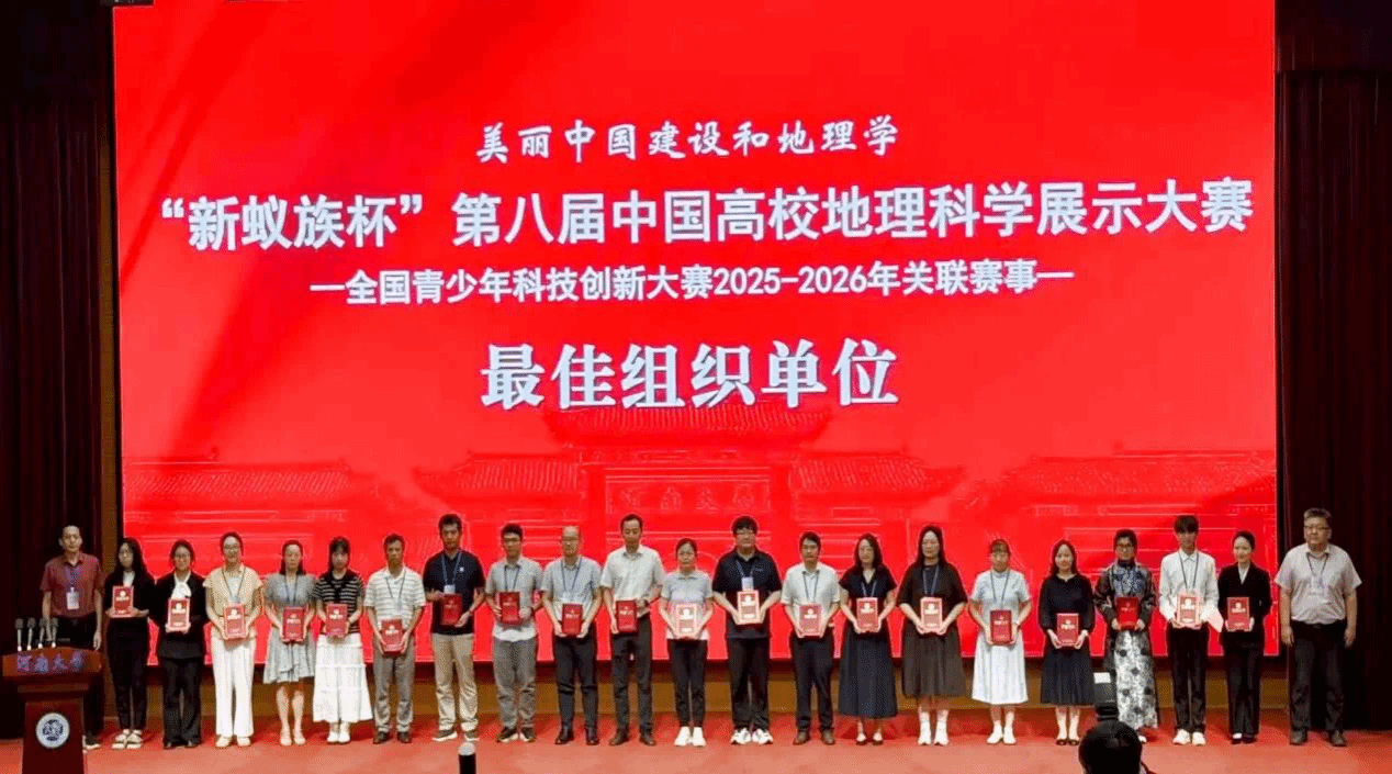 (本网讯)7月26—28日,“新蚁族杯”第八届中国高校地理科学展示大赛全国总决赛在河南大学(开封)成功举办。经济地理学院“地网奇点队”凭借出色的表现,经过多轮激烈角逐,最终斩获“自然地理(含综合地理方向)组二等奖”。同时,经济地理学院在组织工作中的卓越表现,获“最佳组织单位”光荣称号。