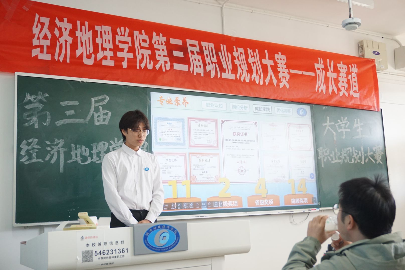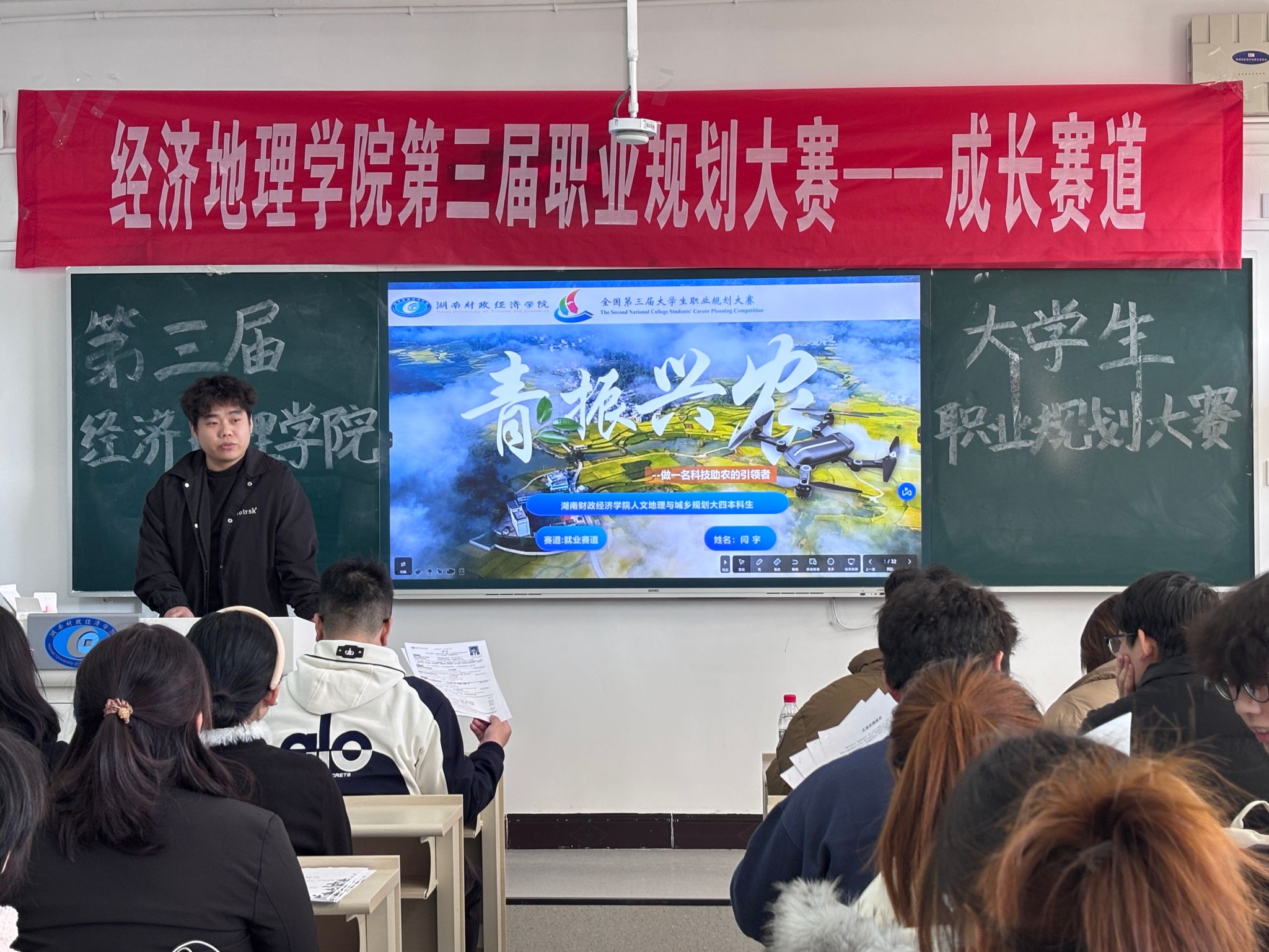 (本网讯)为进一步强化大学生职业生涯教育,持续提升就业指导服务质量,搭建展示职业发展规划与求职实战能力的优质实践平台,11月19日14:30,经济地理学院在主校区第二教学楼2401教室举办第三届大学生职业规划大赛院级选拔赛。本次赛事由学院团学会创新创业部承办,特邀陈四云、许骏、刘权、彭煜曦4位老师担任评委,学院近30名参赛选手同台竞技,展现出青年学子的职业抱负与奋进姿态。