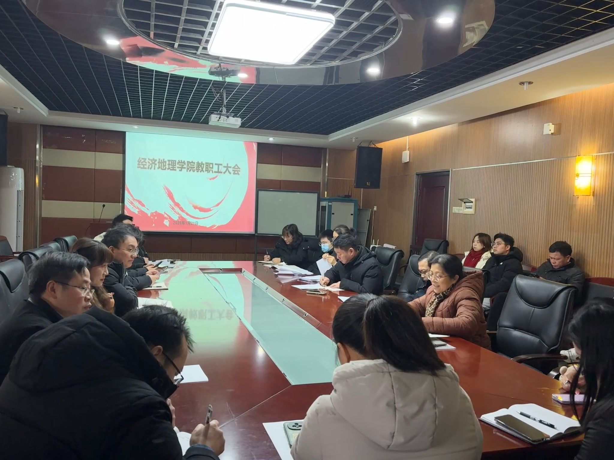 (本网讯)1月21日下午,经济地理学院召开期末教职工大会暨寒假工作部署会。会议全面回顾总结了本学期各项工作成果,深入贯彻上级就业工作会议精神,并就假期重点任务及新学期工作方向进行了周密安排。会议由副院长苏昌贵主持,院长彭文斌、院直属党支部书记姚旭辉及全体教职工共同参会。