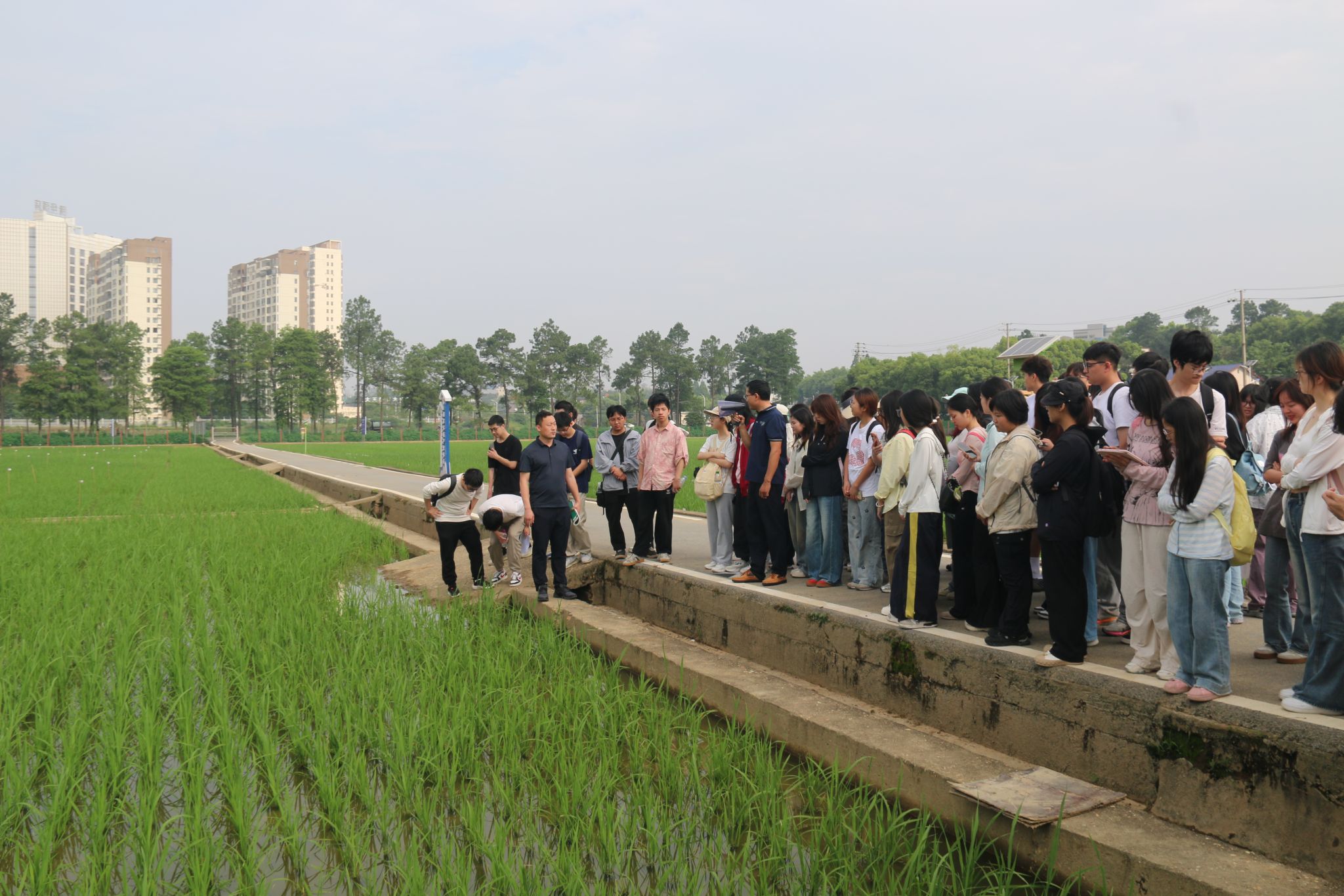 在杂交水稻试验田旁,袁隆平院士的学生刘三雄研究员为师生详细讲解了杂交水稻育种技术的发展历程与最新成果。师生们走进田间,近距离观察水稻分蘖、抽穗等生长状态,深刻体会到农业科技创新的艰辛与突破。大家纷纷表示,袁隆平院士“一生只做一件事”的专注精神和“把饭碗端牢在中国人自己手上”的使命担当令人深受触动。