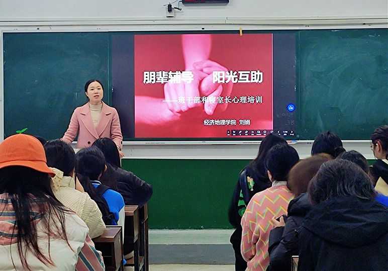 本网讯)为进一步加强学生心理健康教育工作,建设一支具有心理自助和助人能力的学生心理辅导队伍,12月7日下午,经济地理学院在主校区第一教学楼1104教室召开以“朋辈辅导,阳光互助”为主题的心理培训会议。此次培训由学院学工办主任刘娟担任主讲人,2021级、2022级全体班干部和寝室长参加培训。