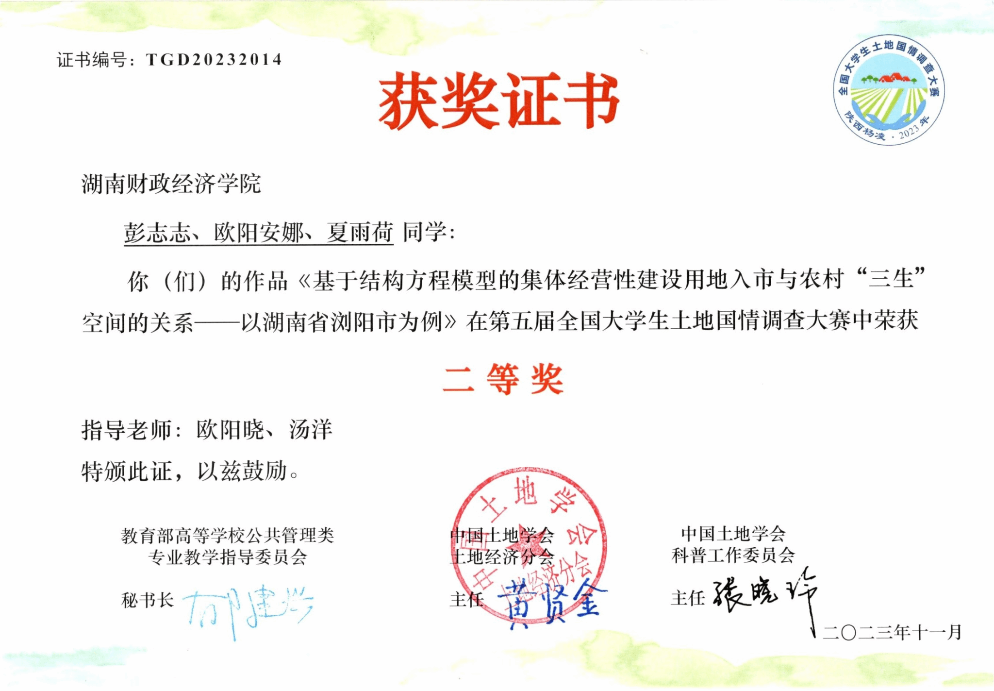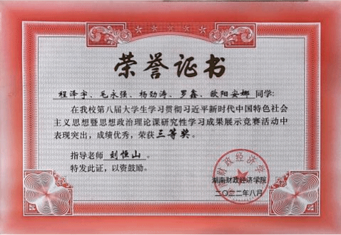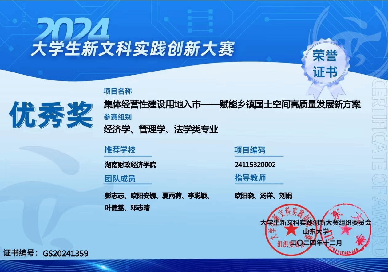 学科竞赛中,405寝室的同学们也是“获奖大户”。彭志志带领团队在第五届全国大学生土地国情调查大赛斩获二等奖,新文科实践创新大赛获全国优秀奖;程泽宇在人民城市全龄友好社区创意大赛、长沙市智力运动会桥牌团体赛获奖;毛永强和小伙伴在“挑战杯”大学生课外科技作品大赛初赛表现出色。这些成绩,是他们实力的证明!每一张证书都诉说了逐梦奋斗的约定,每一个奖项都见证了思维碰撞的火花。这群并肩作战的伙伴们以热爱为帆,以拼搏为桨,在创新实践的星辰大海中破浪前行。