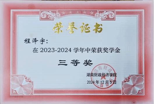 程泽宇,男,汉族,共青团员,2003年9月出生,2021级人文地理与城乡规划班学生,学习委员。目前已取得英语六级证书,曾获得校级三等奖学金、校优秀学生干部等荣誉称号,参与一项校级大创项目。获得人民城市全龄友好社区创意大赛三等奖,长沙市智力运动会桥牌团体赛铜牌。多次参与校园迎新等志愿实践活动。此外,积极参与教师科研项目,如建筑行业发展报告等。