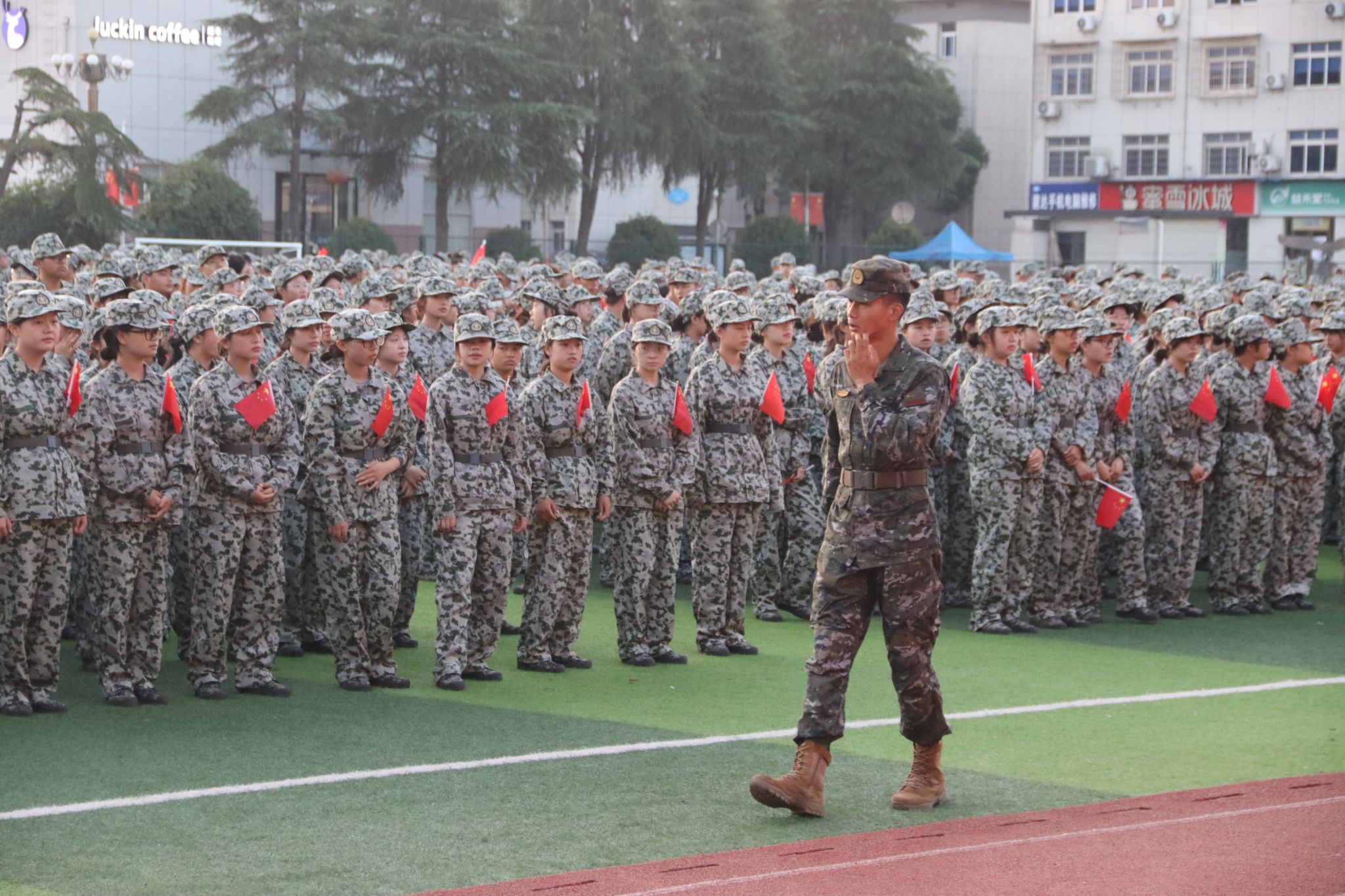 退伍返校后,袁东升充分利用在部队所学的新闻宣传知识,主动请缨担任学校军训宣传工作负责人。他巧妙地将部队的纪律性融入新媒体策划与传播,组建专业团队制作系列短视频。其中,“军训晨曦”单条抖音播放量突破10万+,创下学校军训宣传新纪录。