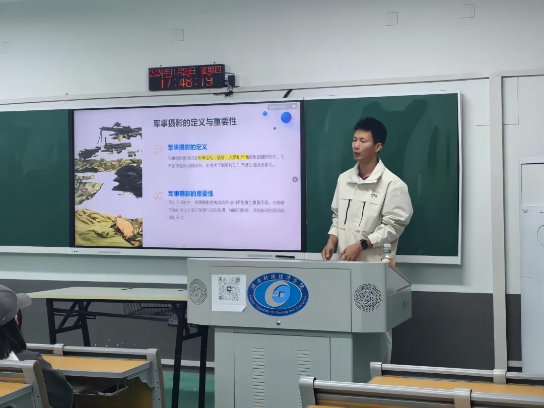“同学们,你们知道界碑的纹路由多少道刻痕组成吗?”在国防教育演讲台上,袁东升用这样的提问点燃同学们的参军热情。他结合自身经历讲述了一个个真实而生动的军旅故事,让越来越多的湖财学子们对军旅生活充满向往,渴望在军营中点亮青春风采、放飞青春梦想。在校级、院级宣讲会上,袁东升结合当前国防形势与青年职业发展规划,鼓励湖财学子们积极响应国家号召,投身军营建功立业。他的讲述和分享备受师生好评,在校园里掀起了一股参军热。