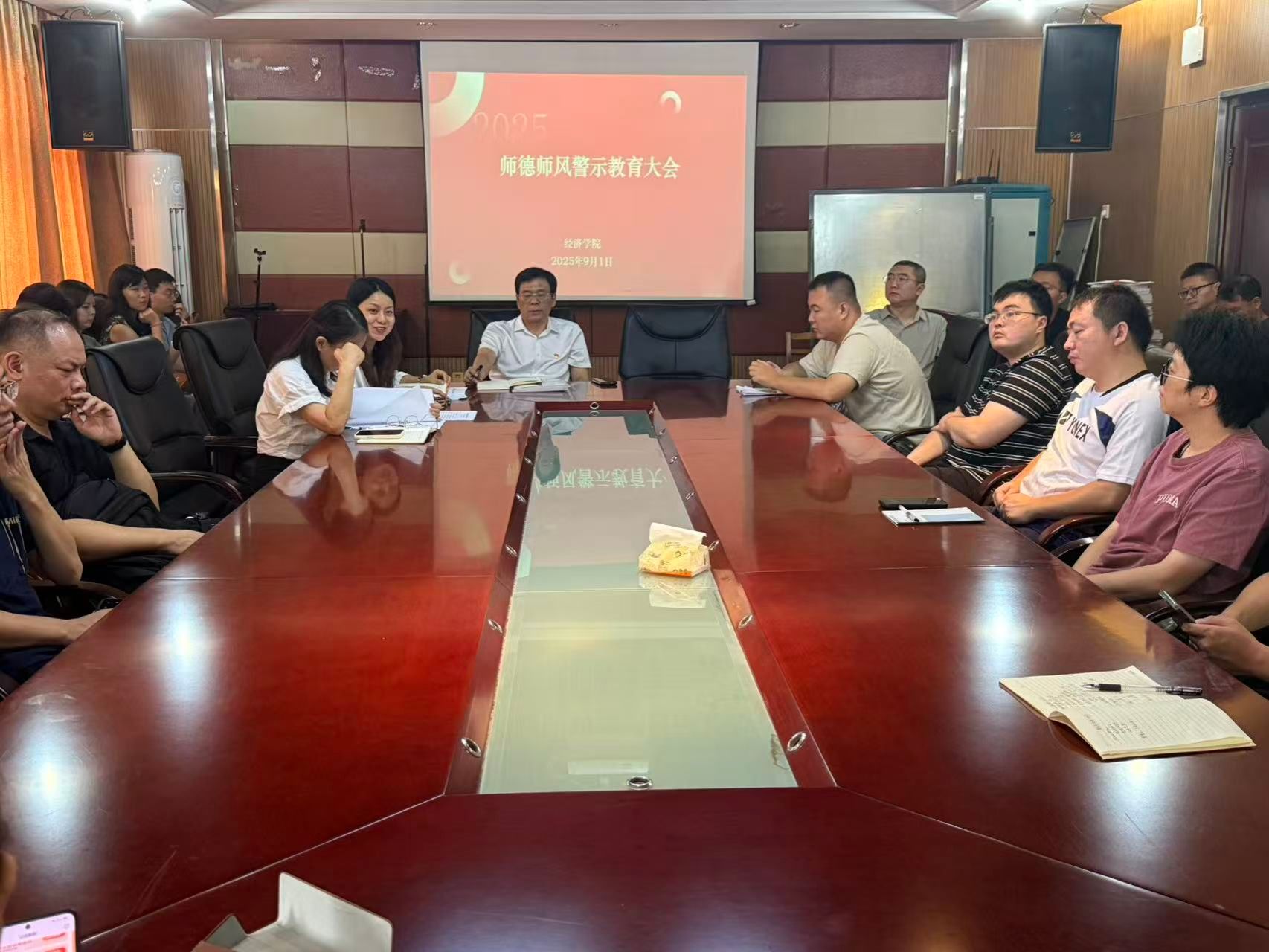 (本网讯)为进一步加强师德师风建设,提升教师职业道德素养,营造风清气正的教育教学环境,经济学院于 9 月 1 日上午在1014会议室召开了师德师风警示教育大会。会议由院长李勇辉主持,学院全体教职工参加。