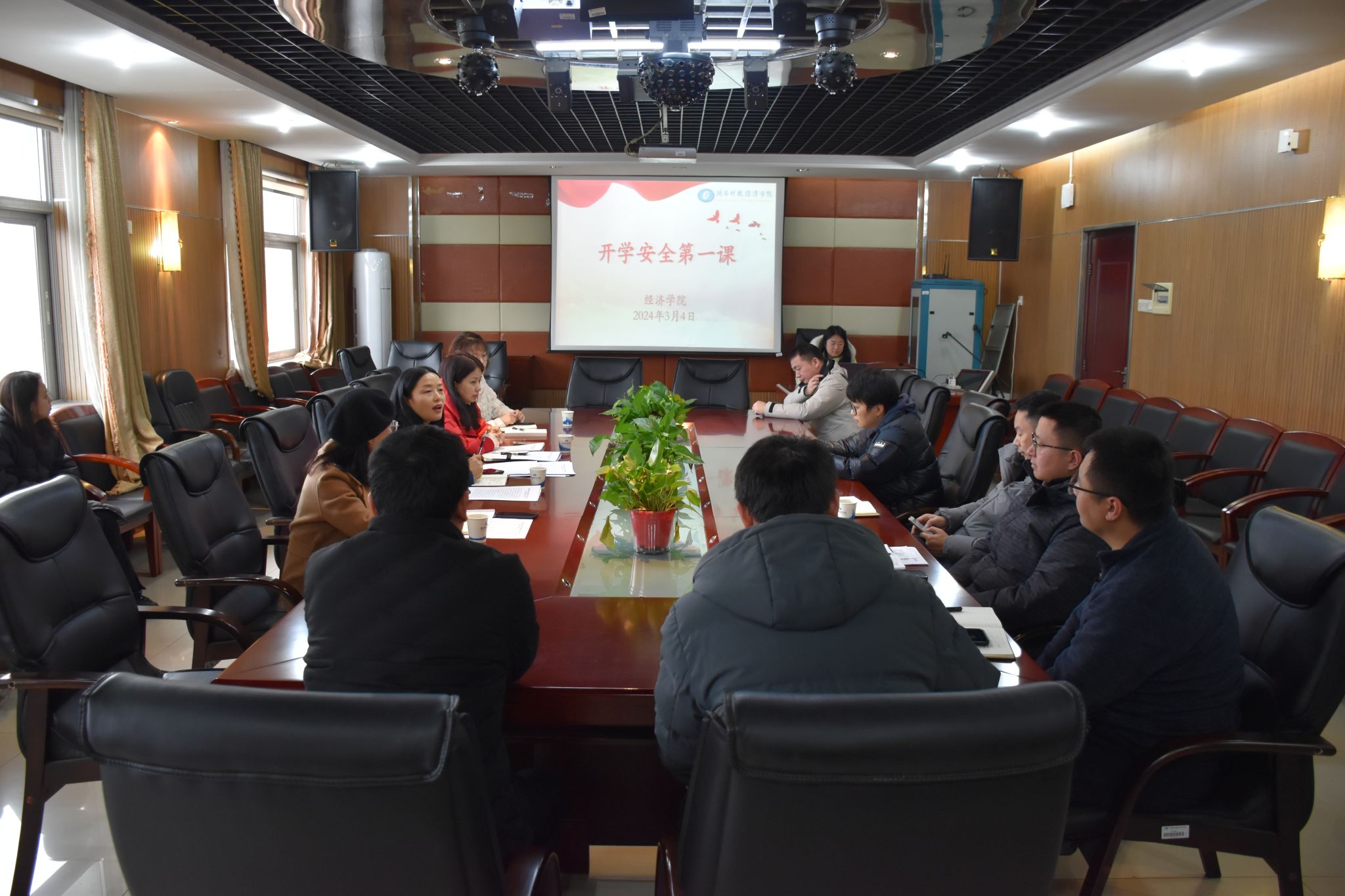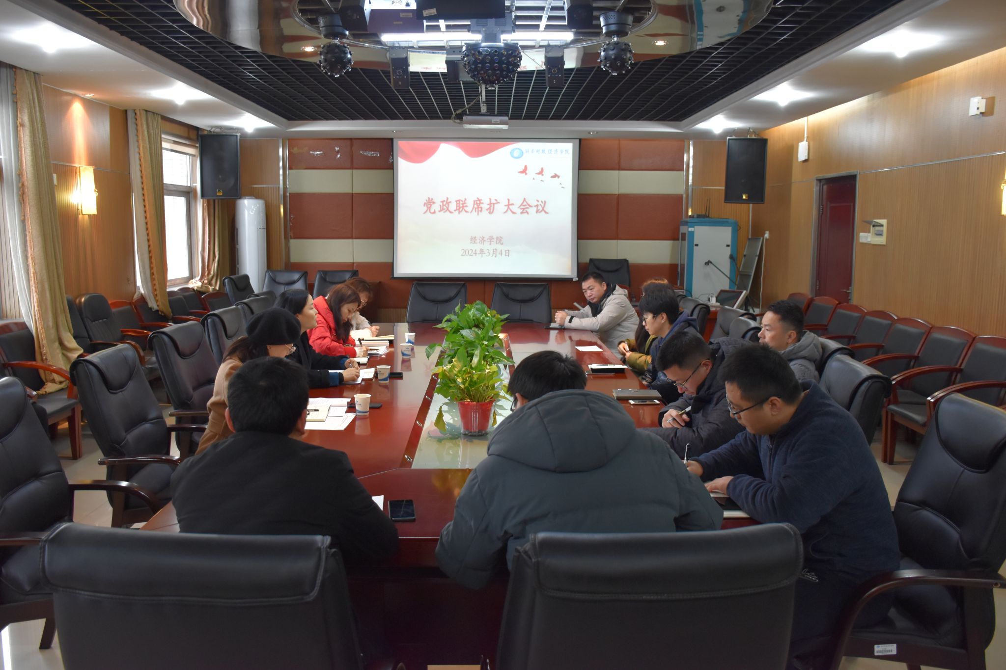 (本网讯)3月4日上午,经济学院在办公楼1014会议室召开党政联席扩大会议。学院全体领导班子成员、各系主任、三办工作人员、全体专兼职辅导员以及院教师党支部书记等参加了会议,党委书记余华主持会议。