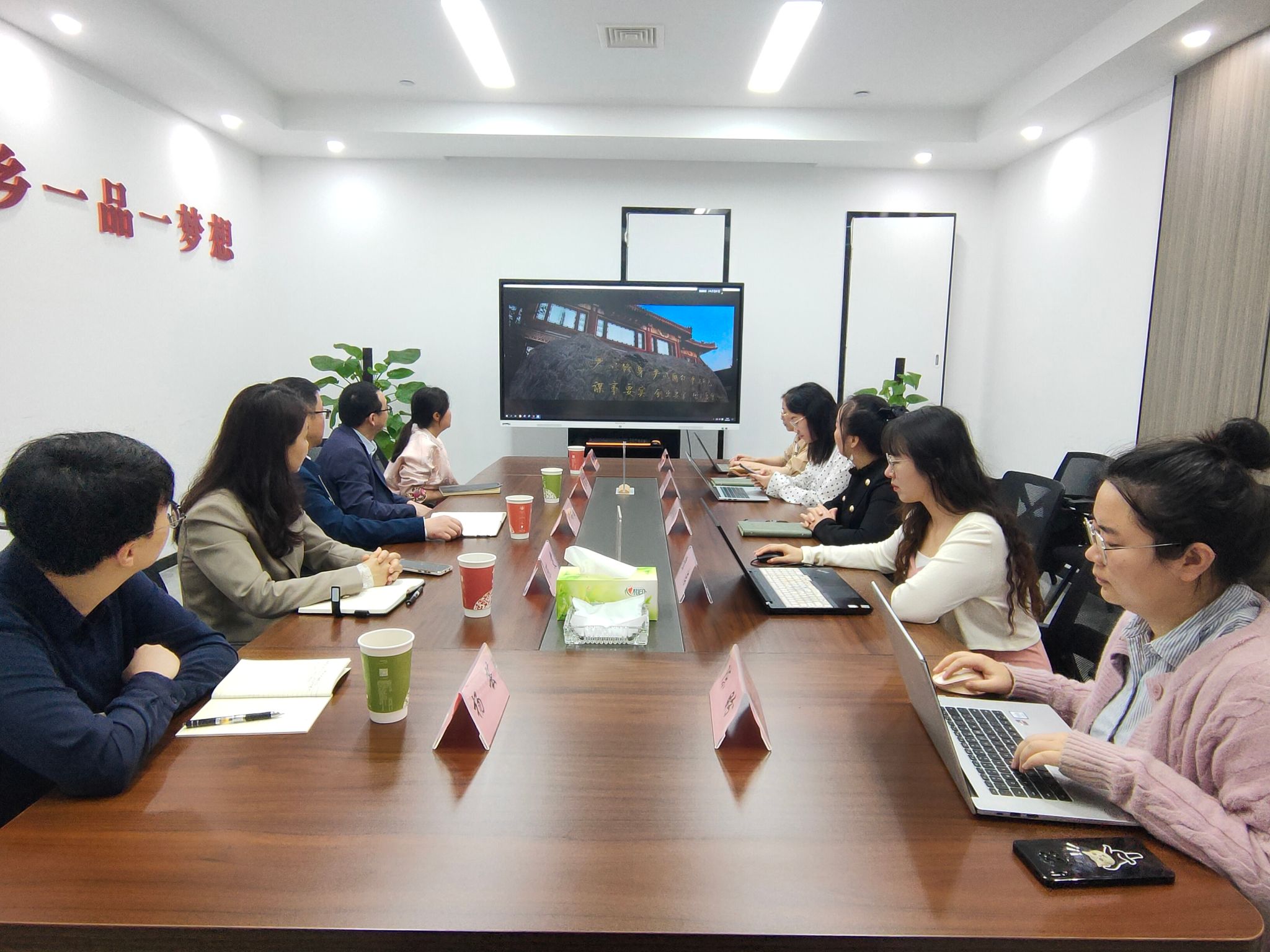 随后的座谈会上,公司副总裁柴娟娟、营销总监周佳丽为到访的领导和老师详细介绍了中国民族贸易促进会以及一乡一品科技有限公司的发展历程,介绍了“一乡一品”成功孵化案例及其在乡村振兴中的贡献。尹向飞和陈雯分别介绍了各自学院的发展历程、学生规模以及专业布局等情况,阐述了学校在实践创新领域与企业深度合作的潜力,强调了实训基地建设、创新创业指导等合作模式的重要性,并就未来可能开展的校企合作形式进行了探讨。双方讨论最终达成多项共识,柴娟娟表达了与学校强化合作的愿望,提议通过专业认知讲座、实践指导、以赛促教等形式推进双方合作,共同推动实践成果的转化。
