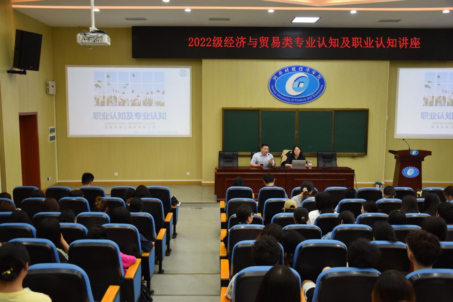 (本网讯)为引导学生在专业分流前更好地认知国际经济与贸易专业,了解行业发展和就业方向,扎实做好学生职业生涯规划,5月8日下午,经济学院在2J02举办专业认知与职业认知讲座。讲座由湖南利来达钢铁有限公司总经理曾瑛主讲,经济学院党委副书记刘英、国际商务系系主任张扬、辅导员王竹青,以及2022级经济与贸易类专业全体学生参加此次讲座,讲座由国际经济与贸易系系主任肖迎春主持。