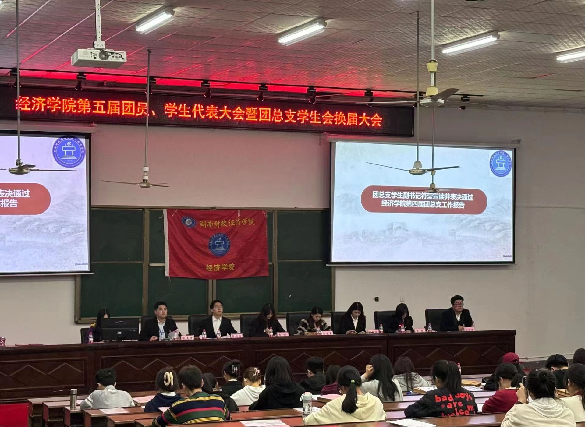 (本网讯)11月7日,经济学院团总支学生会(以下简称“团学会”)在2J01教室召开了第五次团员、学生代表大会暨团总支学生会换届大会。经济学院党委副书记刘英、副院长陈雯、学工办负责人谢龙、团总支书记宋赛男、辅导员李伦、各院嘉宾、经济学院学生代表和全体团学会成员出席了此次会议,大会由学生会执行主席毛志廷主持。