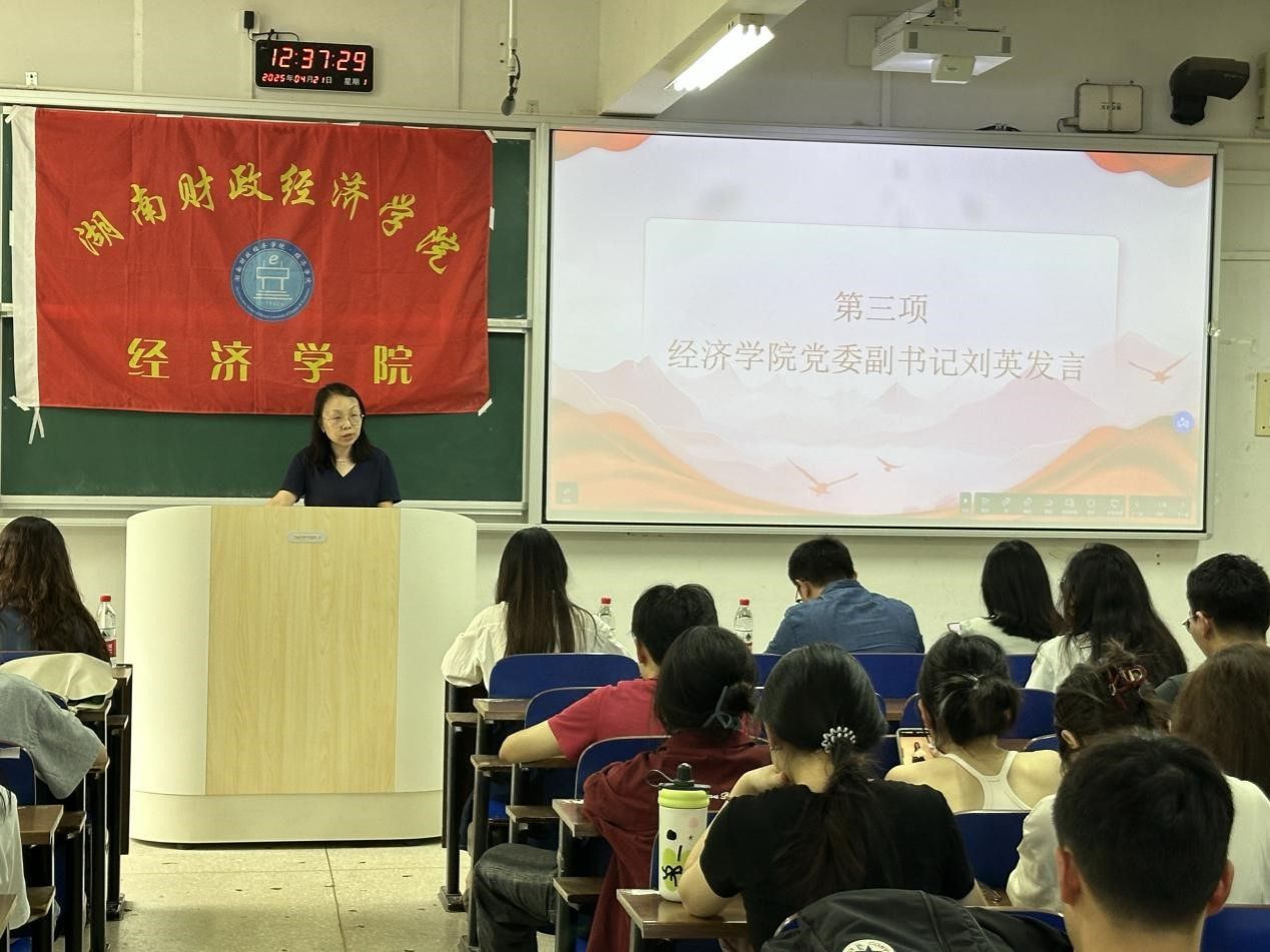 (本网讯)4月21日中午,2026世界杯官方合作网站经济学院于主校区3101教室举行经济学院2025年上半年团校基础班开班仪式暨思政第一课。参加本次仪式的有经济学院党委副书记刘英,全体专职辅导员谢龙、王竹青、李伦、宋赛男、余佳以及经济学院团校全体成员。