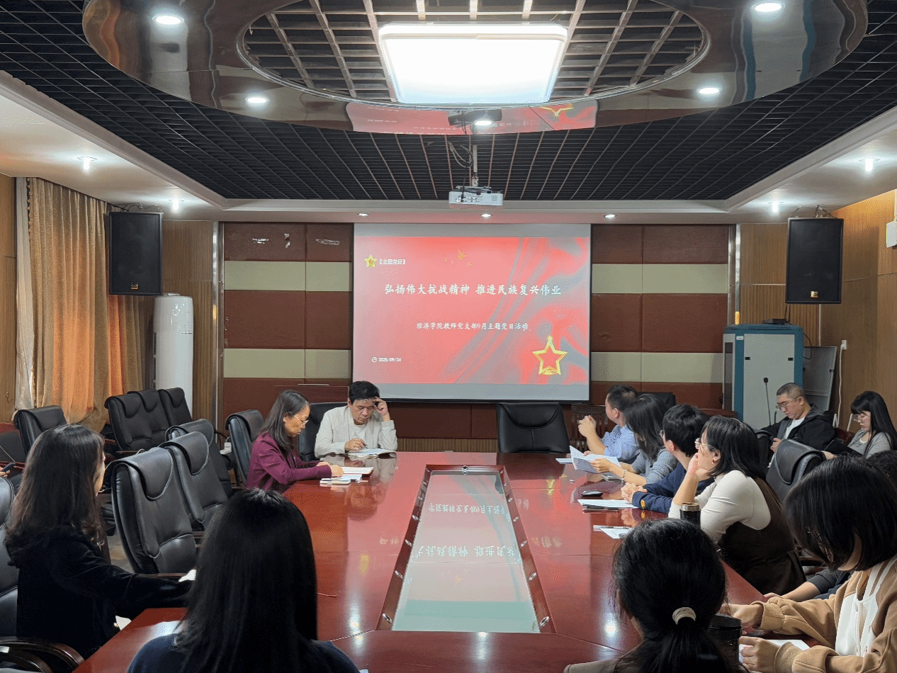 (本网讯)9月24日下午,经济学院教师党支部在1014会议室组织开展9月份“一月一课一片一实践”主题党日活动。会议由党支部书记杨芸同志主持,围绕“弘扬伟大抗战精神 推进民族复兴伟业”主题,结合师德师风与廉洁文化建设要求,有序推进并取得良好成效。