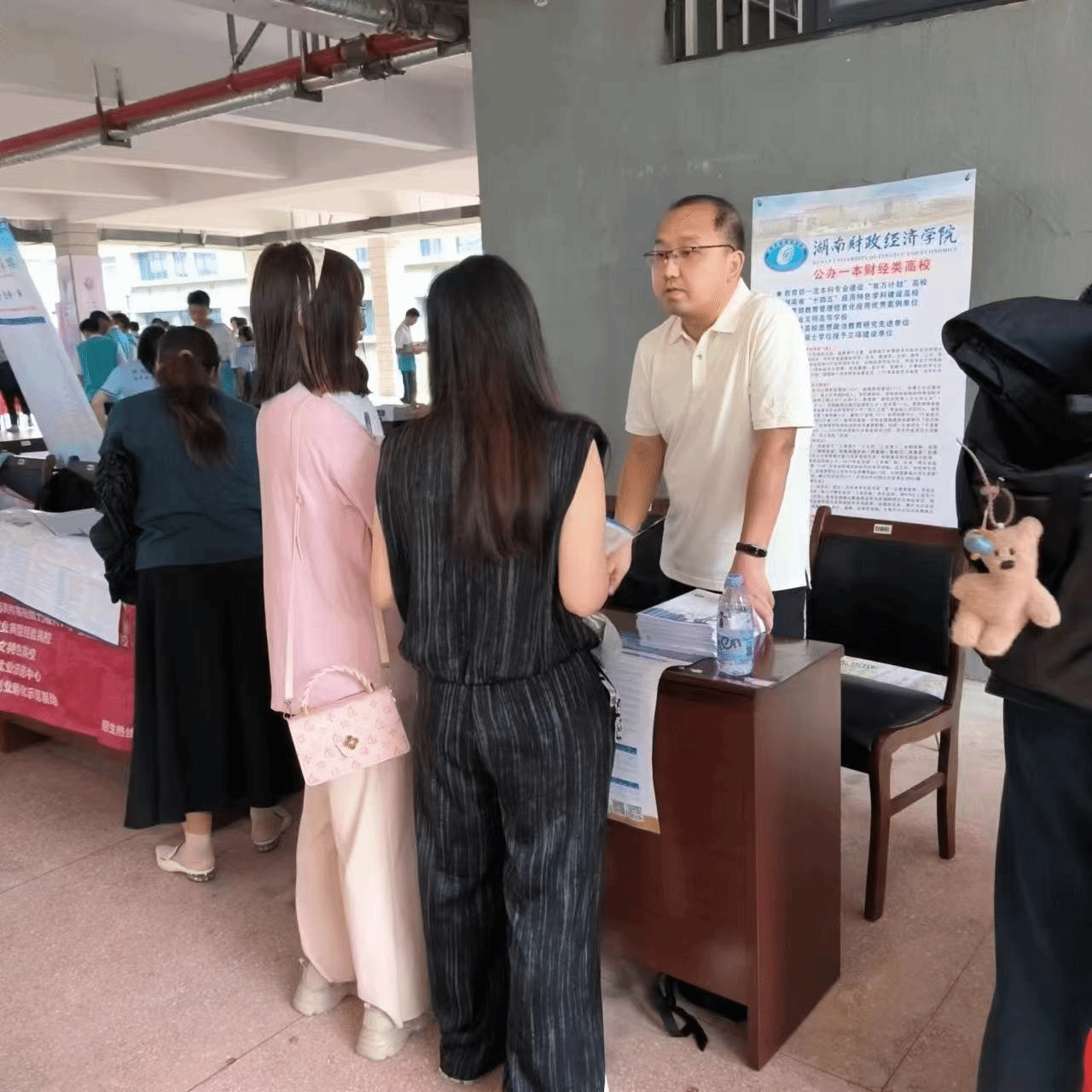(3) 积极投身于各项工作。2024年暑期方坤老师经济参加招生工作。在积极学习本年度高考招生制度后,经济学院招生团队赴常德市历时三天时间,先后在汉寿县第一中学、常德芷兰实验学校、常德市第一中学开展招生活动。作为团队一员,方坤老师搭建宣传台,分发宣传资料,积极为学生和家长讲解,取得了良好宣传效果。