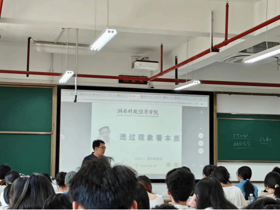 黄华军教授以电影《流浪地球2》中550W到Moss的进化为切入点,强调专业认知需跳出专业局限。回溯金融历史脉络,从2000多年前古希腊因海洋贸易孕育金融起源,到中国古代夏商周至秦的金融进步,再到欧洲文艺复兴时期现代金融启蒙,最终落脚数字经济时代的金融变革。他给金融科技的同学推荐了《人类简史》《今日简史》《未来简史》等11本书,并特别推荐我校党委书记易棉阳所著《数字经济史》,鼓励在座同学能通过理解历史规律,拓宽认知边界,把握未来趋势来进行多维度学习。