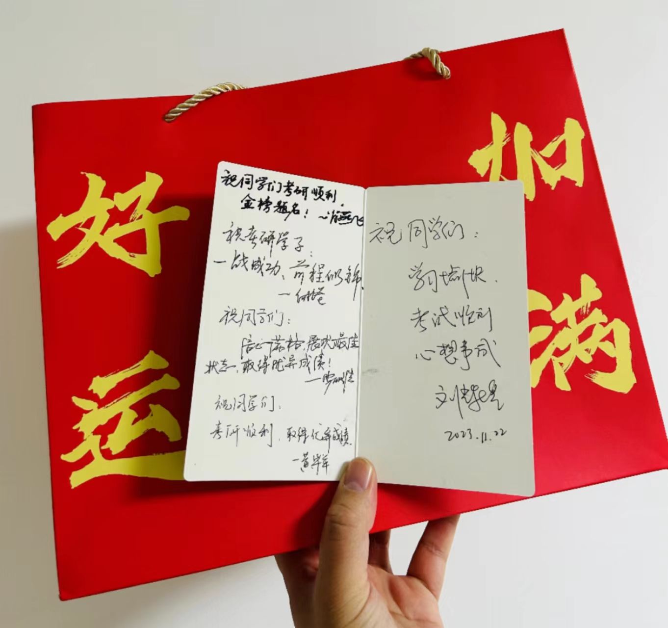学院领导们首先为考研学子发放了手写贺卡和考研文具包,院领导手写贺卡承载了真挚祝福,考研文具包传达了暖心关怀。会上,院长刘辉煌首先肯定了同学们埋头苦干的韧劲,鼓励同学们要继续坚持,为自己的梦想努力奋斗,他代表学院祝愿大家能够在考试中取得理想成绩,成功上岸!院党委书记肖燕飞叮嘱同学们要劳逸结合,放平心态、从容应考,他强调学院时刻关心和牵挂着每一位考研同学,永远是大家最坚强的后盾和最温暖的港湾。收到学院的关心与祝福,考研学子们纷纷表示:“一定认真备考,绝不言弃,不辜负父母和老师的期望,也不辜负自己最初的梦想。”