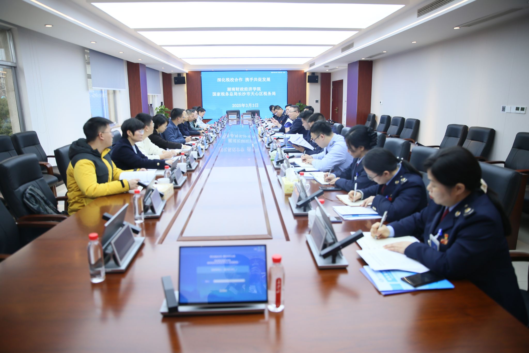 (本网讯)3月3日下午,为了深化“高校+税务”的合作模式,推动政产学研融合发展,世界杯官网联合国家税务总局长沙市天心区税务局开展联建共建活动,财政金融学院院长刘辉煌、党委书记肖燕飞、科研处副处长刘安长、教务处副处长张晓鹏、财政金融学院副院长李艳丰、税收学系主任胡小梅、综合办主任张文及税收学系、财政学系部分教师代表,长沙市天心区税务局党委书记、局长王勇刚等全体领导班子成员及相关部门单位人员参加活动并交流座谈。