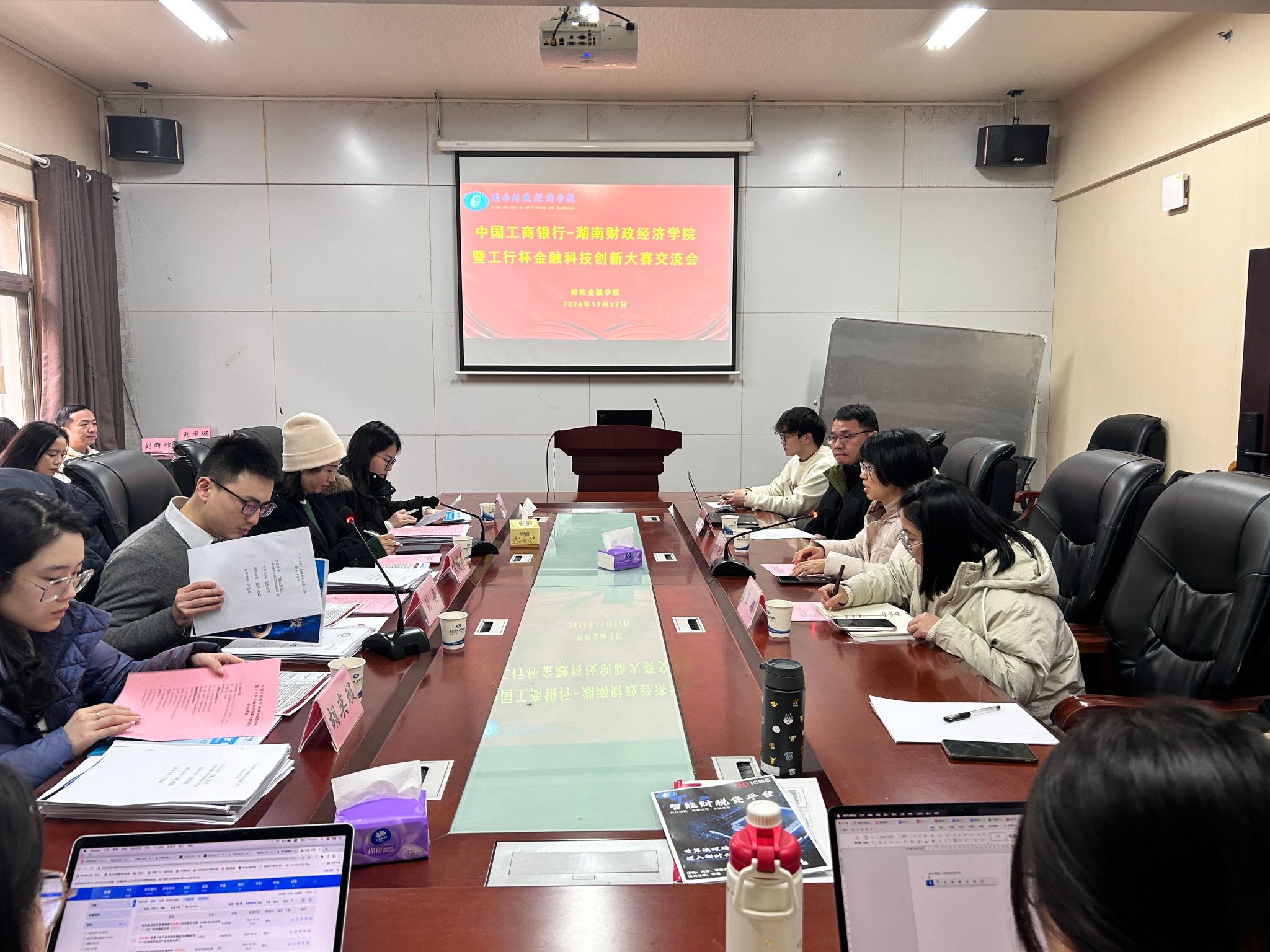 为促进金融科技人才创新能力的培养, 2024年12月27日下午,财政金融学院在办公楼119会议室成功举办“工行杯”金融科技创新大赛交流会。工商银行湖南分行金融科技部团队莅临现场为学生作品提质打磨,财政金融学院李艳丰副院长、金融科技系主任王娟、财政学系主任汪圣国、投资学系主任李金、尹惠斌副教授、朱桑之博士等多位老师,金融学、金融科技、投资学等专业学生参加交流会。