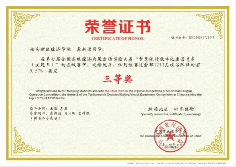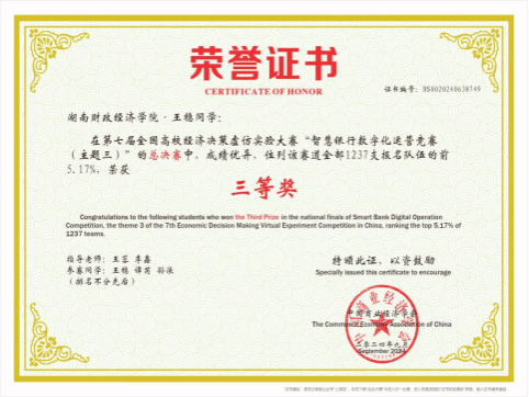 (图为第七届全国高校经济决策虚拟仿真实验大赛获奖证书)