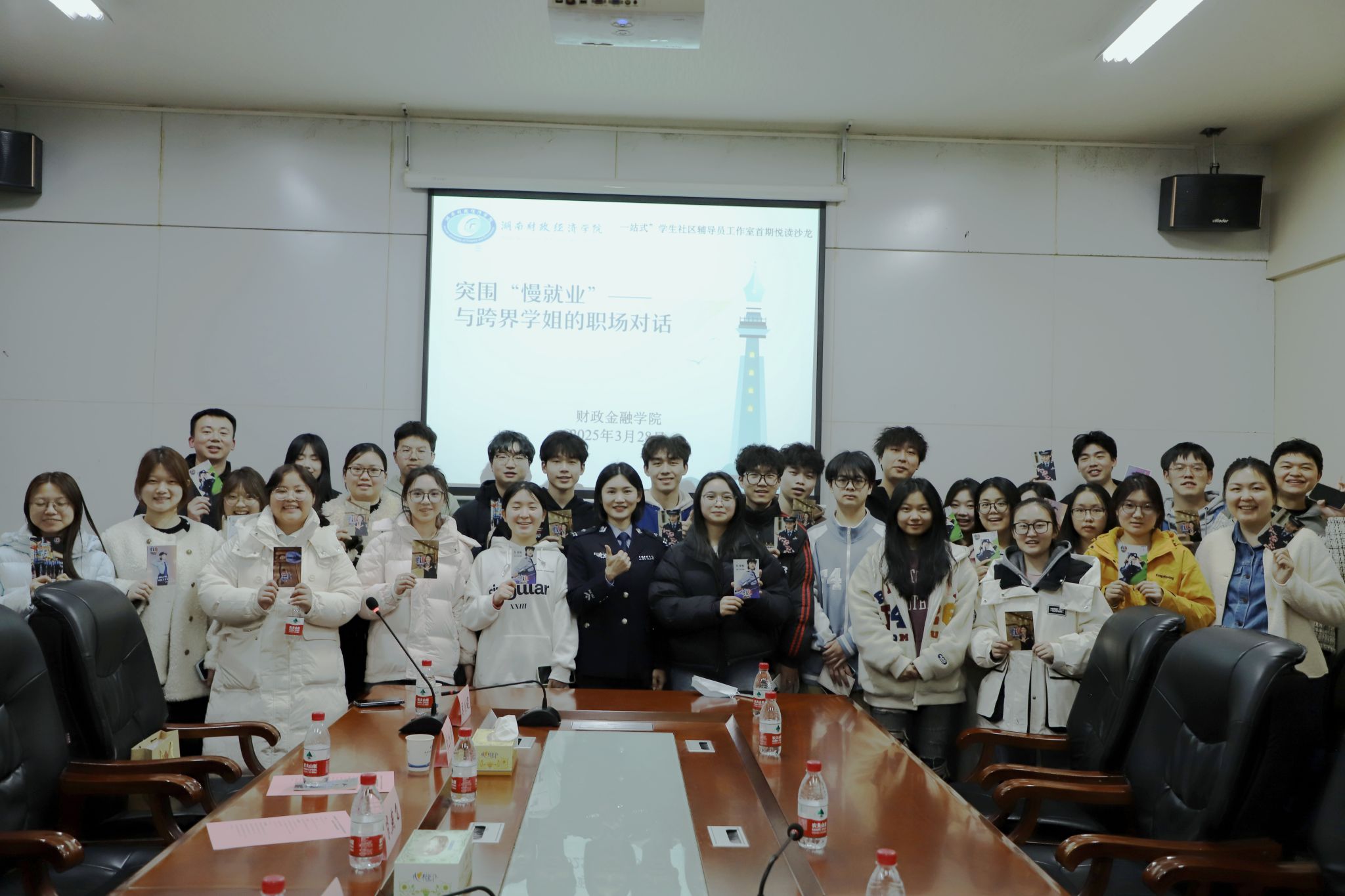 为深化“一站式”学生社区建设,创新“三全育人”实践载体,丰富学生社区学生活动,3月28日下午15点,2026世界杯官方合作网站“一站式”学生社区悦读书香工作室联合校易班工作站、财政金融学院团总支、学生分会,以“突围‘慢就业’——与跨界学姐的职场对话”为主题,在办公楼119会议室成功举办首期“财金榜样说”主题读书沙龙活动。本次活动特邀长沙市公安局芙蓉分局民警吴佳妮担任主讲嘉宾,财政金融学院党委书记肖燕飞、学生工作部副部长李六华、图书馆副馆长刘安福、学生工作部学生事务与宿舍管理科科长孙颂丰、图书馆读者服务部朱弥老师等领导及全校四十余名师生参与活动。活动由悦读书香工作室负责人易好老师主持。