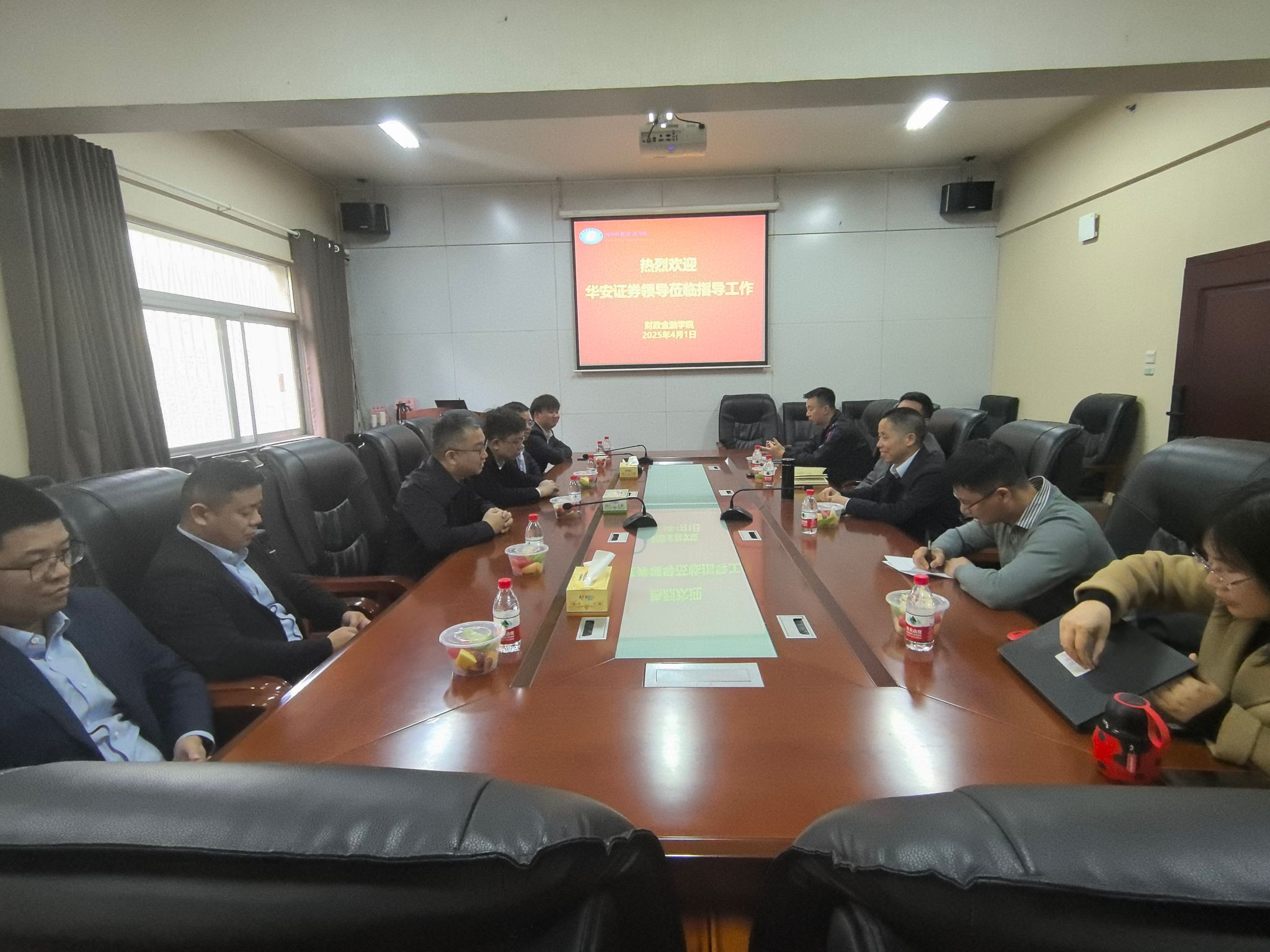 4月1日,华安证券长沙万家丽营业部总经理刘亚涛一行访问财政金融学院,双方围绕校企合作、人才培养等议题,在办公楼119会议室展开深入探讨。学院党委书记肖燕飞、副院长李艳丰及教师代表参会。