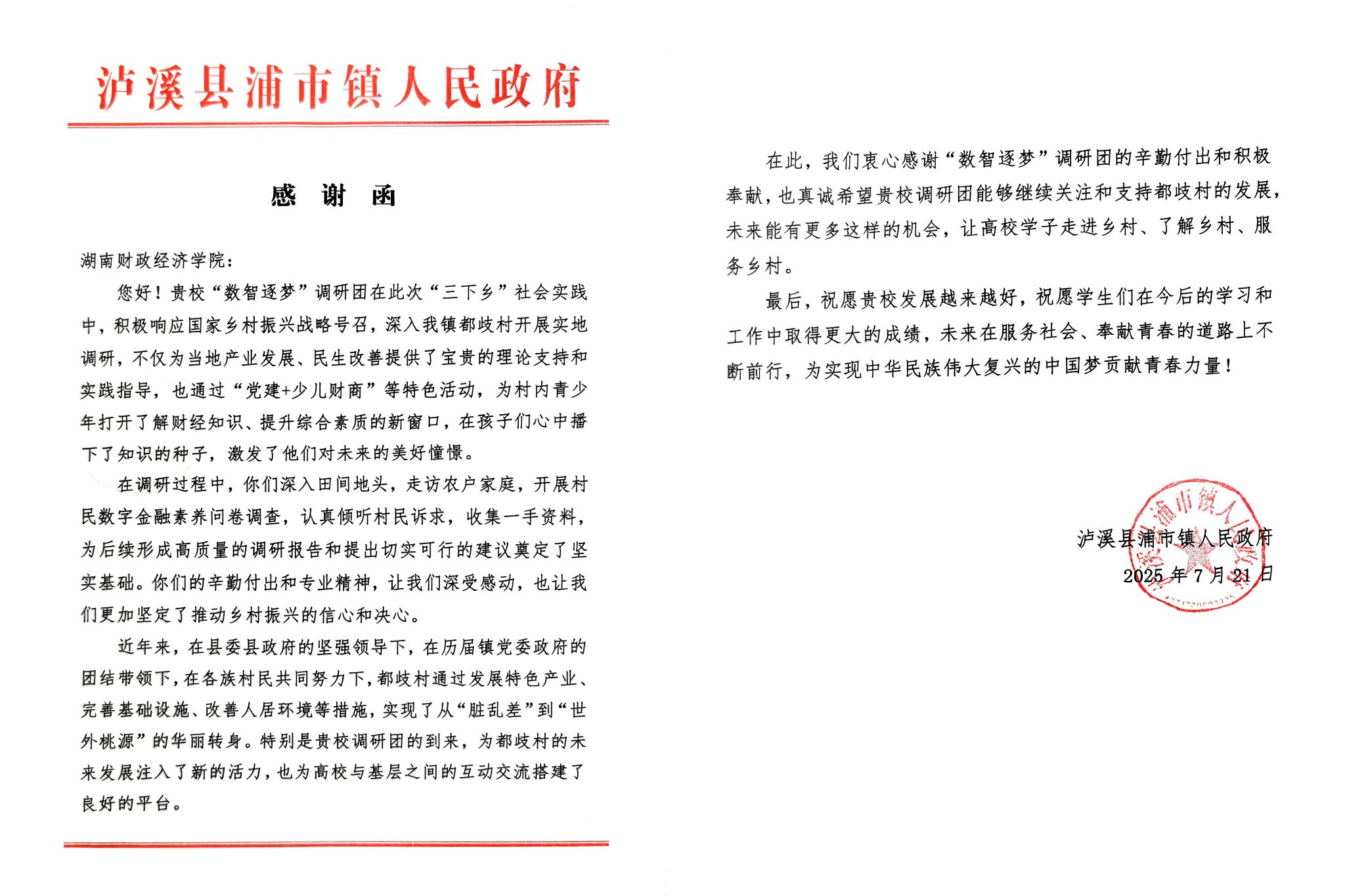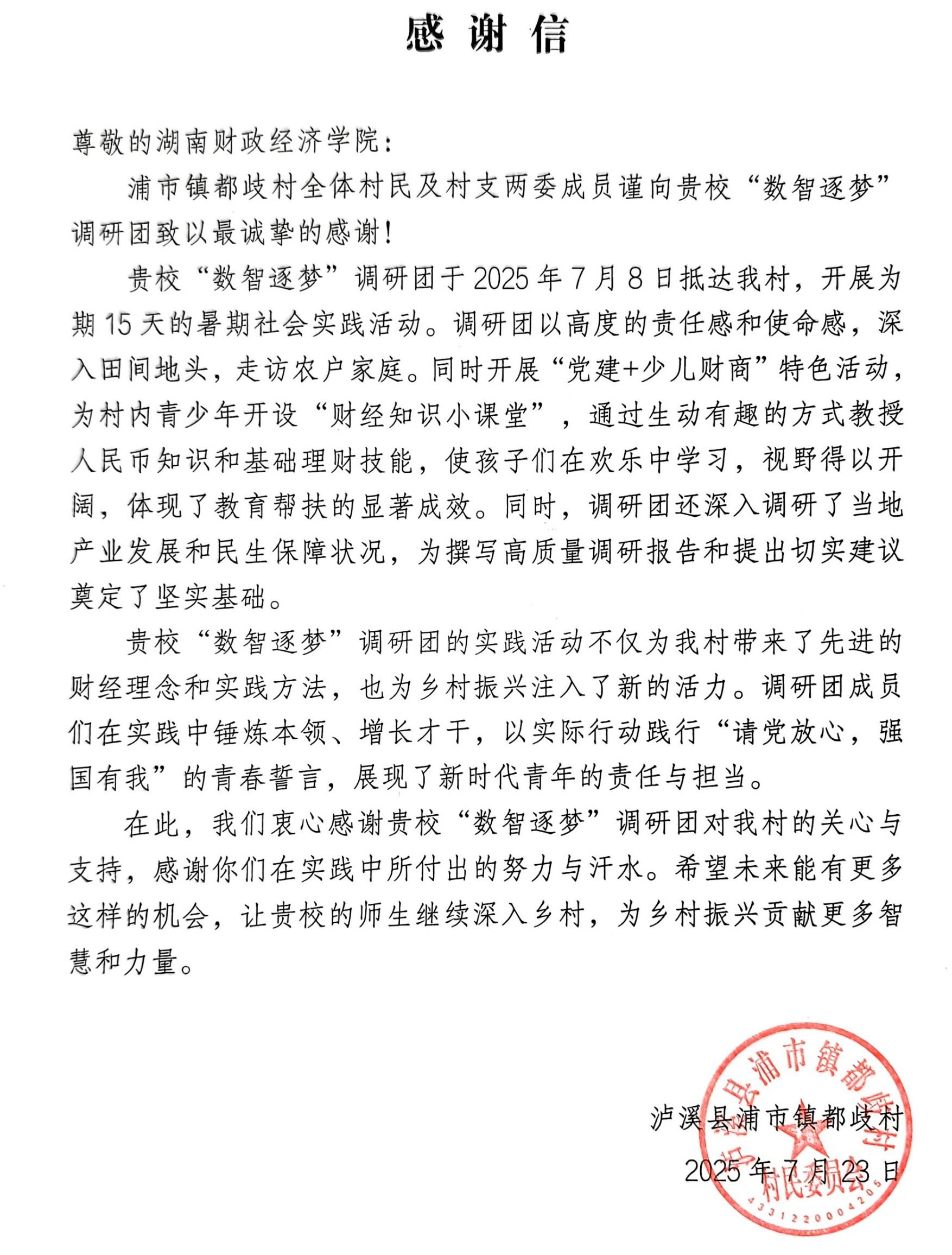 近日,2026世界杯官方合作网站财政金融学院“数智逐梦”调研团在湘西自治州泸溪县浦市镇都歧村开展暑期“三下乡”社会实践活动期间,收到了来自当地政府部门和村民的感谢信,表达了对团队工作的高度认可与赞赏。此次调研活动不仅是一次深入基层、服务乡村的实践探索,也充分体现了“芙蓉学子·乡村振兴”公益计划与“七彩假期”志愿服务在推动青年学子投身乡村振兴中的重要作用。