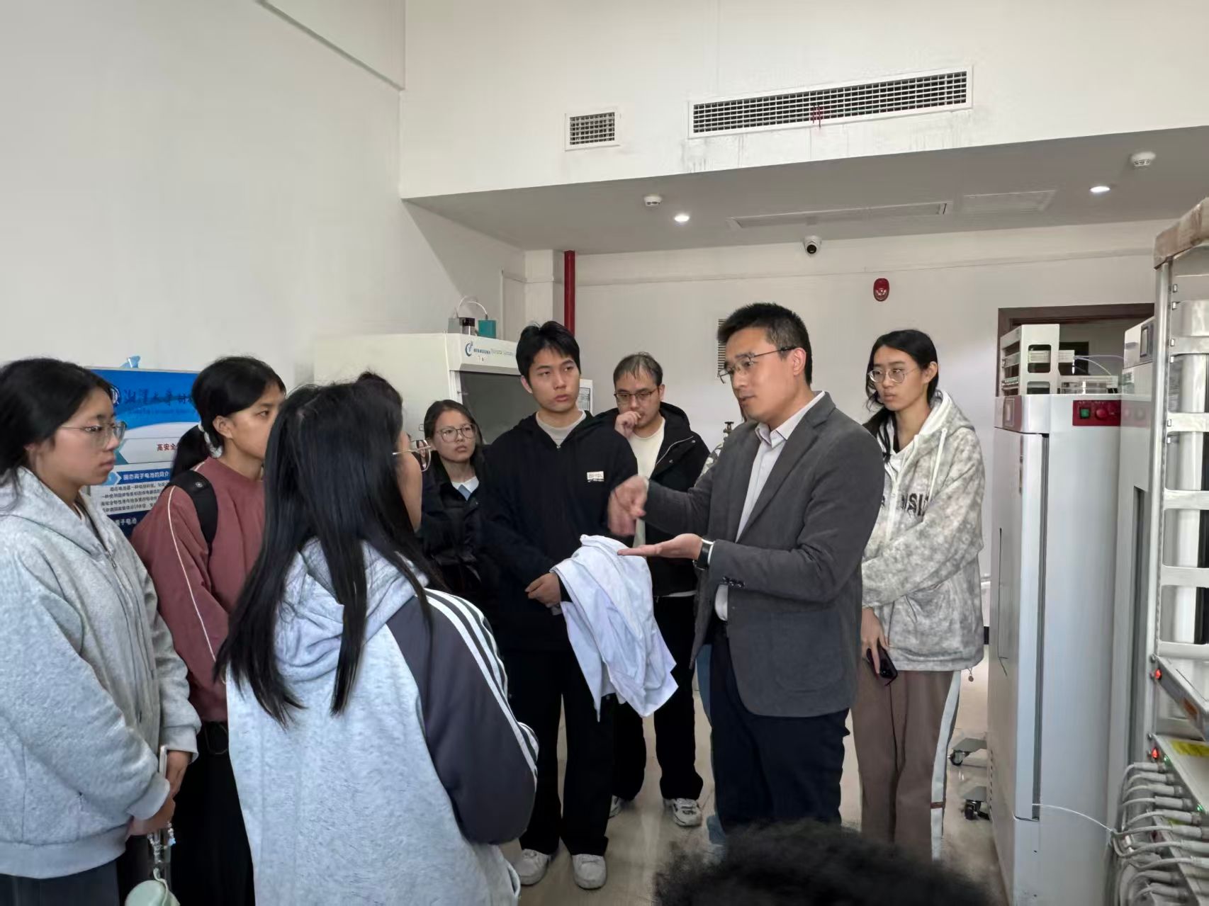 在张彪副教授的随行指导下,团队重点围绕低功耗电池技术路径展开探讨,对能源管理方案有了更清晰的认识;宋奎教授则从材料结构的角度出发,为同学们解析机械性能优化的可能方向,拓展了大家对功能材料设计的理解边界。