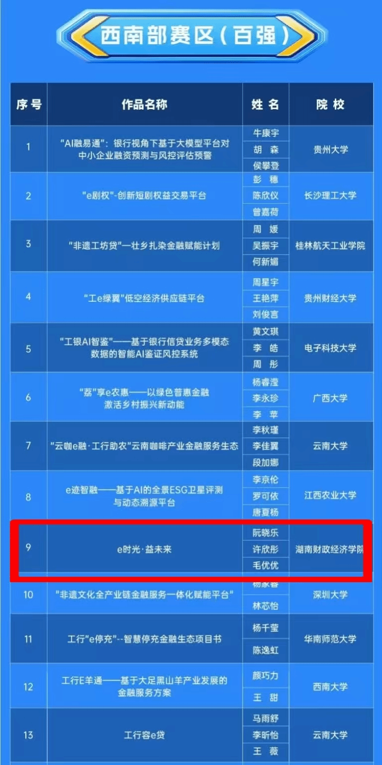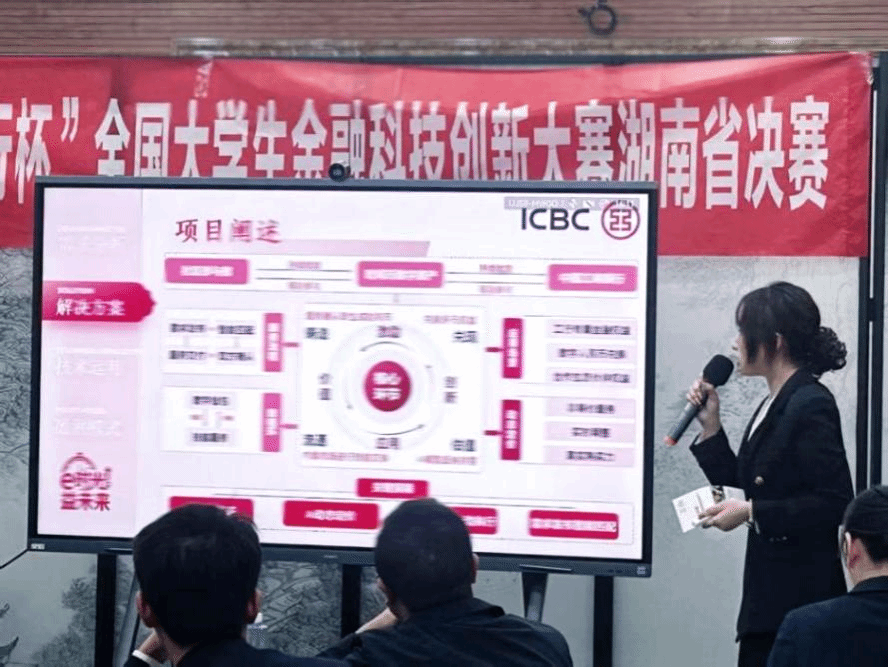 杨俊和胡小梅老师指导,阮晓乐、许欣彤和毛优优团队作品《e时光·益未来》结合区块链、智能合约技术,聚焦银发经济与可持续发展,以创新的解决方案获湖南赛区特等奖和西南部赛区百强,这是世界杯官网在工行杯金融创新大赛中取得的新突破。由李博达和李艳丰老师指导,陈泊涵、谢灵曦和李畅团队作品《情绪e站》关注Z世代消费行为,探索金融赋能情绪资产,荣获省级一等奖。《随e智服》、《e数达》《乡野e趣》等项目覆盖脑机支付、数据征信、乡村振兴等多个热点研究领域,分别荣获省级二等奖和三等奖,彰显学生对行业痛点的深刻洞察和积极探索。