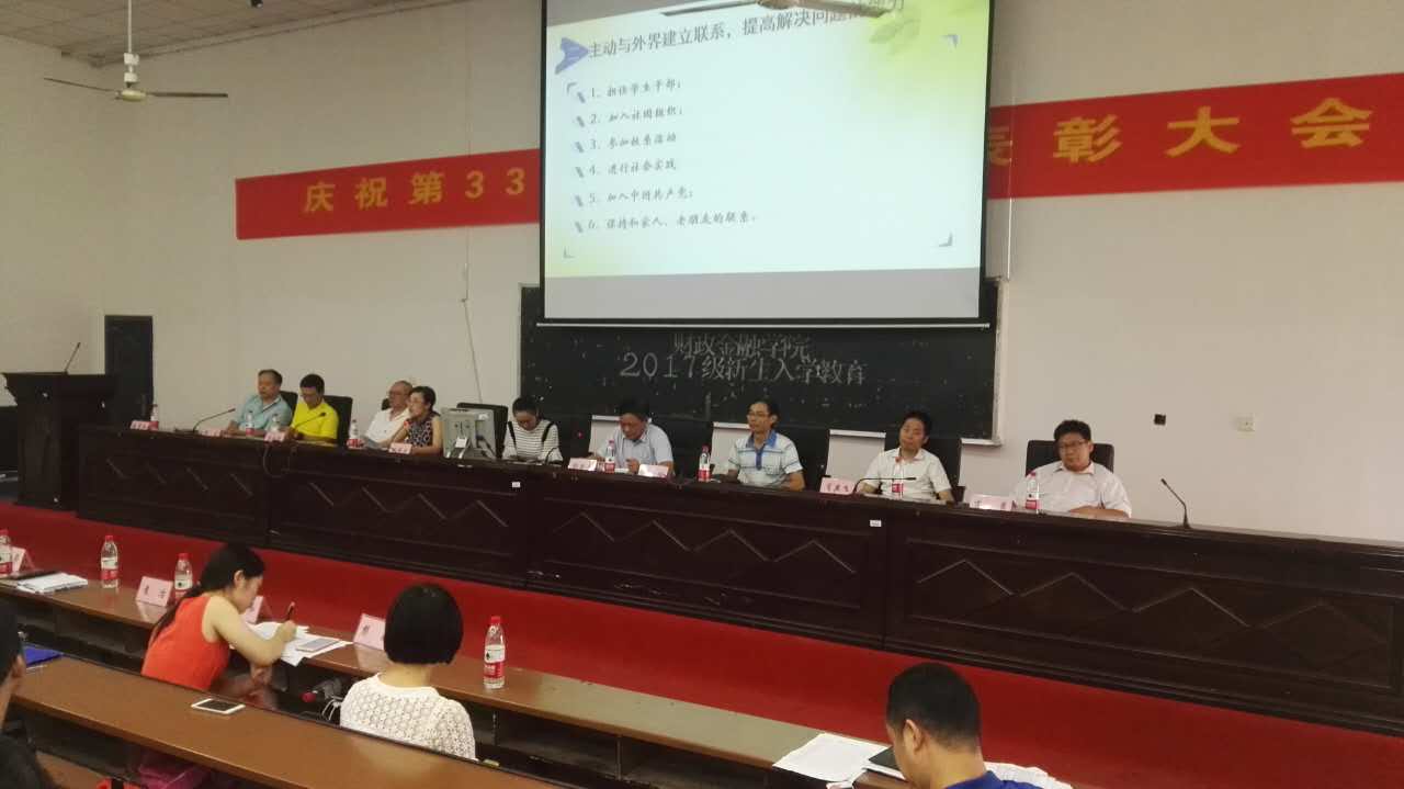 (本网讯)9月9日上午,财政金融学院在2J01教室举行2017级新生入学教育大会,会议由该院党总支书记彭爱平主持。该院常务副院长罗四维、党总支副书记刘绿丝、副院长肖燕飞、财政学系系主任肖勇、金融学系系主任袁建武...