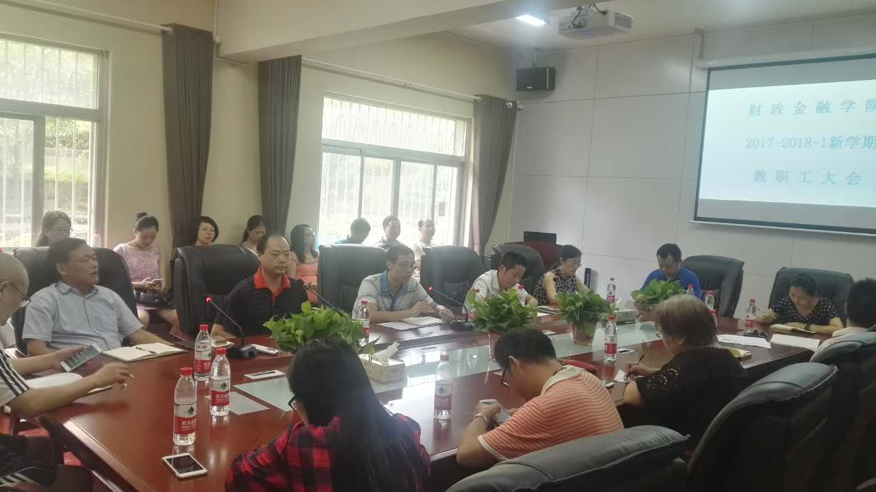 (本网讯)9月9日下午,财政金融学院在办公楼119会议室召开新学期教职工大会。会议由该院党总支书记彭爱平主持。会上,该院常务副院长罗四维,党总支副书记刘绿丝,副院长肖燕飞分别从本科教学合格评估冲刺阶段工作、...