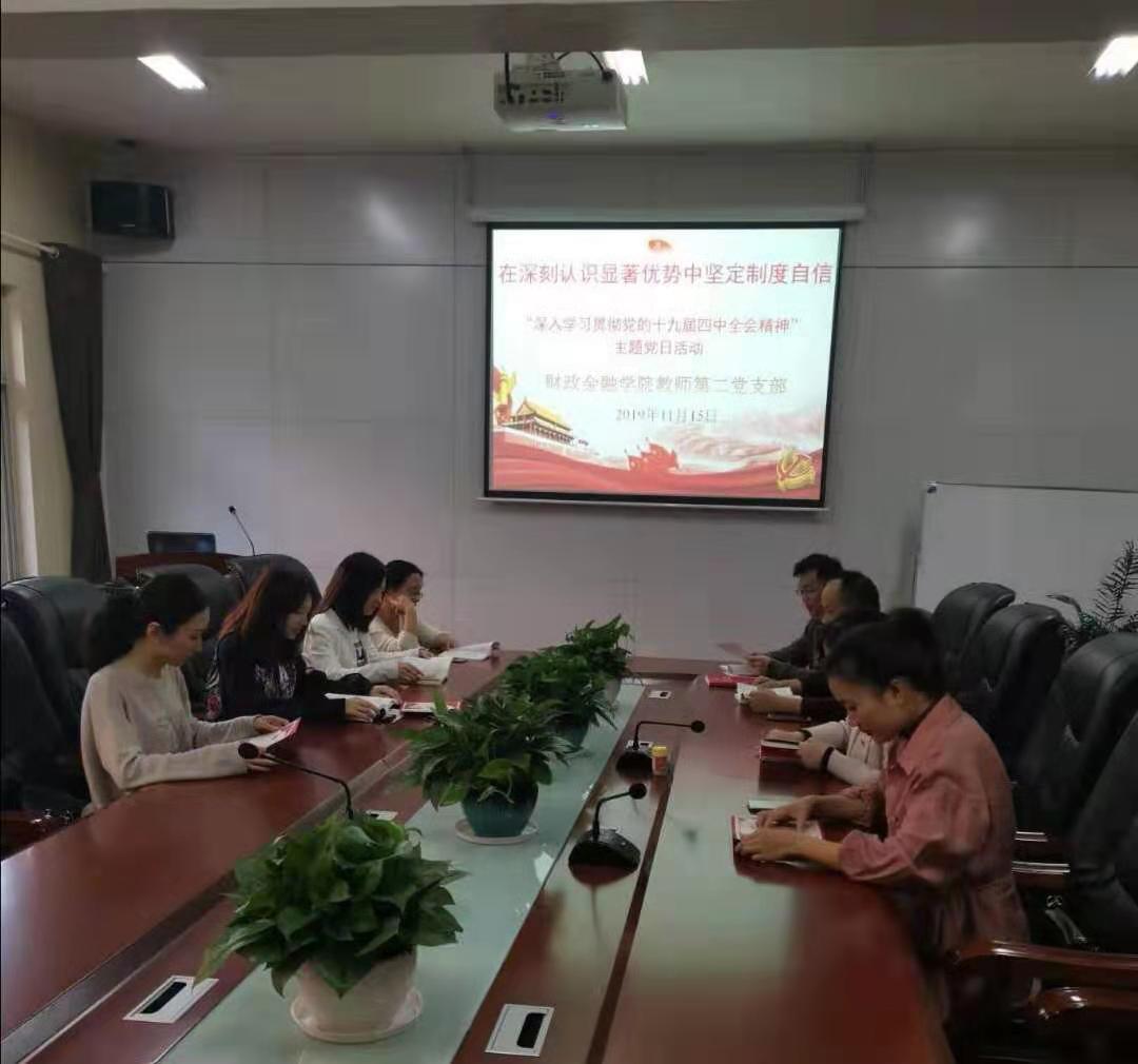 (本网讯)2019年11月15日,财政金融学院教师第二党支部在办公楼119召开党员大会,开展学习党的十九届四中全会精神主题党日活动和党员政治生日活动。会上,党支部书记尹惠斌带领大家学习了《中国共产党第十九届中央委...