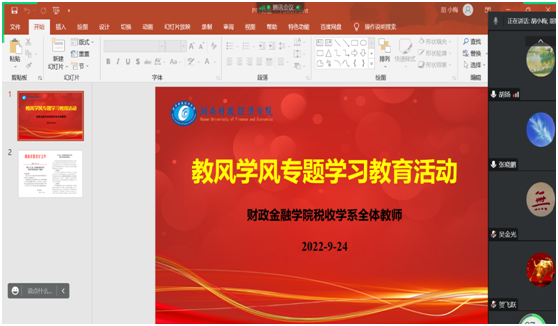 (本网讯)9月24日下午,为学习贯彻湖南省教育厅《关于进一步加强普通高等学校教风学风建设的意见》等文件精神,税收学系特开展线上教风学风专题学习教育活动,活动由系主任胡小梅副教授主持,税收学系全体教师参加。...