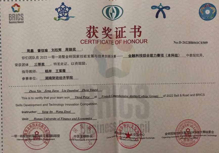 (本网讯)近日,2022一带一路暨金砖国家技能发展与技术创新大赛之金融科技综合能力赛项全国总决赛圆满结束,世界杯官网金融科技专业学生周鑫、曾佳瑜、刘权辉、周颖奕在杨岸、王紫薇两位老师的指导下荣获全国三等奖。获奖证...