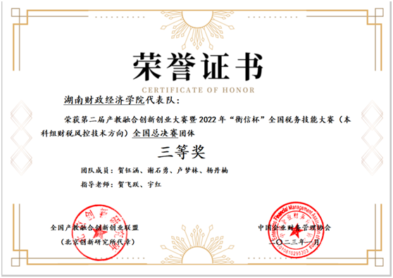 (本网讯)3月17日上午,财政金融学院在办公楼119举行2022年“衡信杯”全国税务技能大赛暨智慧财税数字技术大赛颁奖仪式。学院副院长李艳丰、税收学系全体专任教师、浙江衡信教育科技有限公司徐彪经理以及获奖学生等...