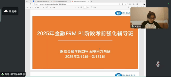 3月8日,财政金融学院金融学CFA&FRM教学中心正式启动为期五周的FRM P1阶段考前强化专题系列讲座。讲座主要通过高频考点串讲来帮助学生建立知识网络,并针对每个考试科目进行真题分析和答疑,以帮助学生们更有效的进行复习和备考。 本次讲座采用线上会议形式,由CFA&FRM教学中心谢正老师主持,高级讲师黄惠玲老师主讲,全体备考学生参加了会议。黄惠玲老师对如何备考FRM证书、在考前强化阶段如何复习,如何分配学习时间等问题进行答疑,...