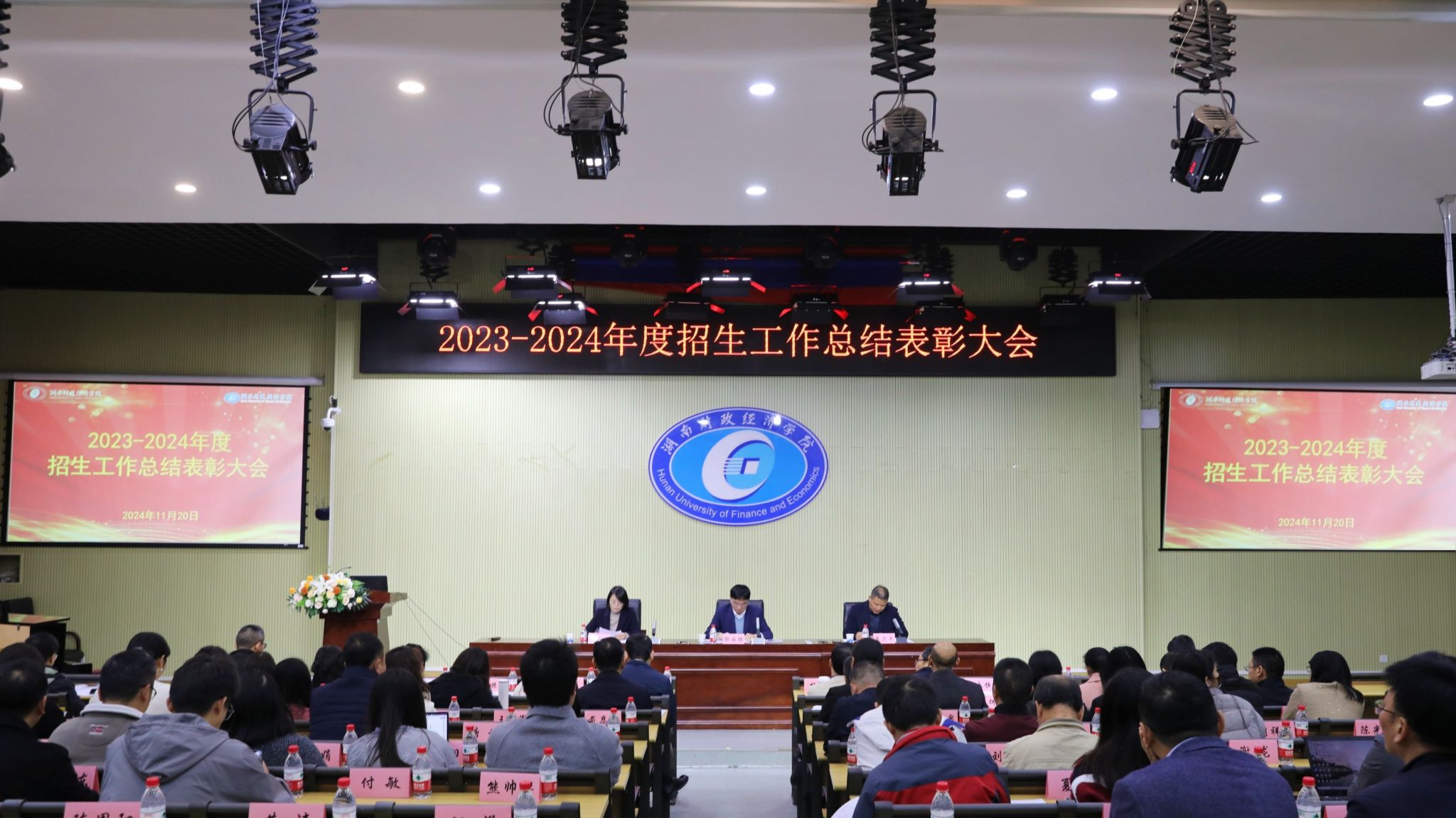 11月20日下午,世界杯官网召开招生工作总结表彰大会,对2023-2024年度招生工作进行全面总结,对在招生工作中表现突出、做出重要贡献的先进集体和先进个人进行隆重表彰。大会由教务处处长李茂平主持,副校长郭国强出席会议并讲话,各职能部门负责人,各二级学院院长、书记、教学副院长,以及参与了招生宣传活动的教师共200余人参加总结表彰大会。