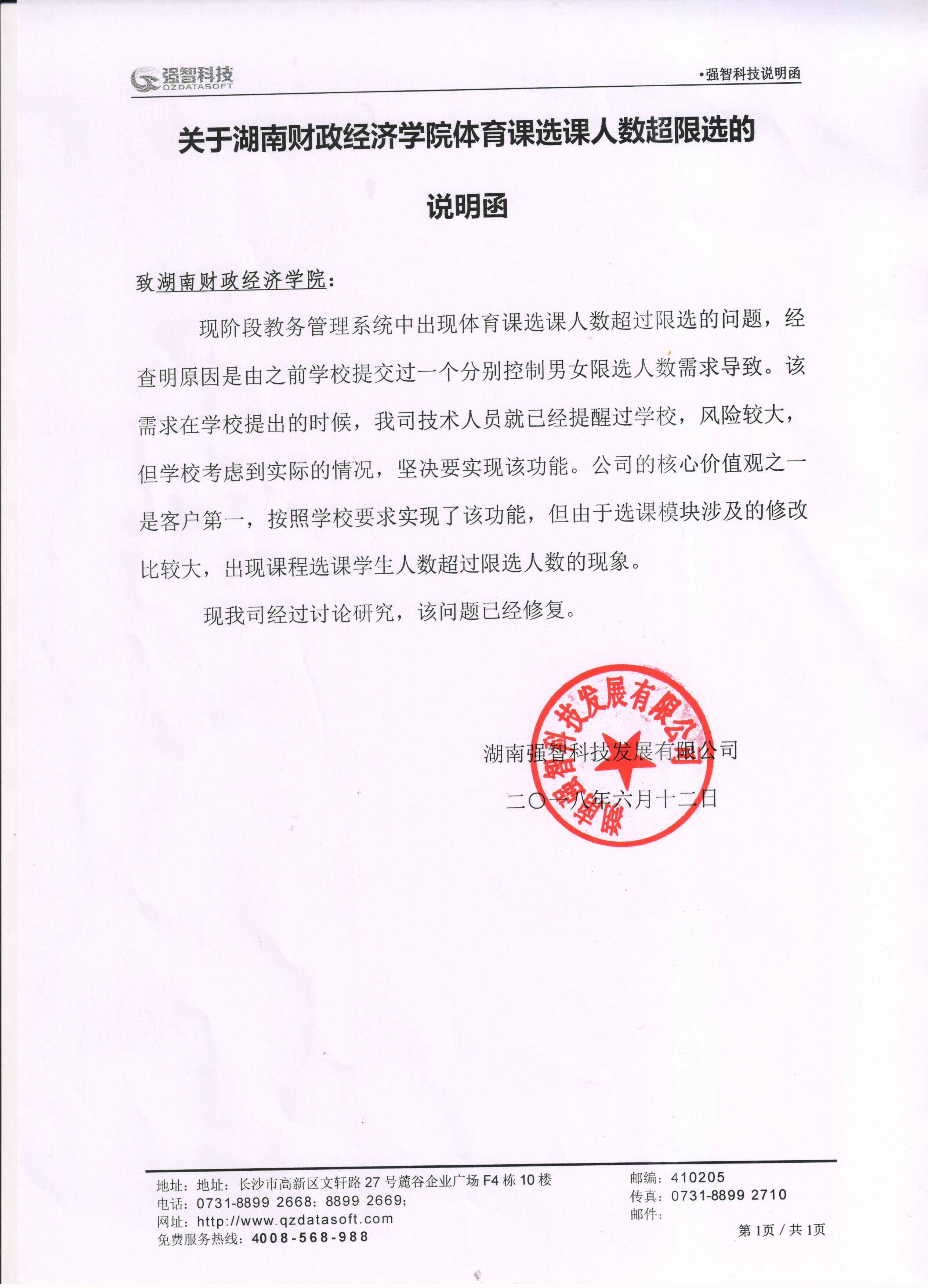 附件1:湖南强智科技发展有限公司《关于2026世界杯官方合作网站体育选课人数超限选的说明函》