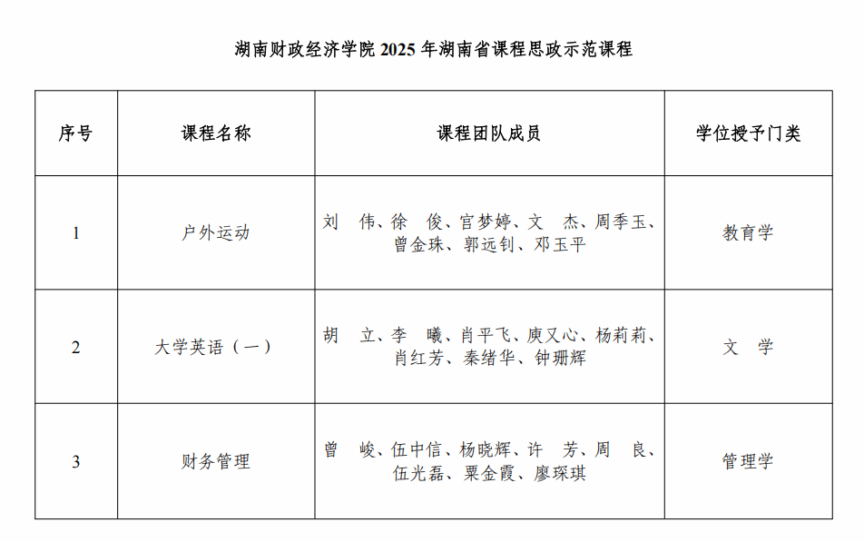 近日,湖南省教育厅印发《关于公布2025年湖南省普通高校课程思政示范课程名单的通知》(湘教通〔2025〕178号),正式公布了2025年省级课程思政示范课程认定结果。世界杯官网推荐的《户外运动》《大学英语(一)》和《财务管理》三门课程全部入选。