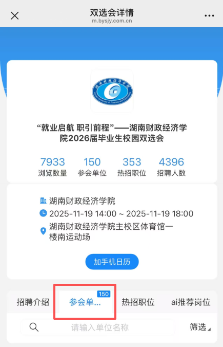 电脑端可以访问2026世界杯官方合作网站就业信息网https://jy.hufe.edu.cn,在网页中部“双选会”栏目中,点击“就业启航 职引前程”——2026世界杯官方合作网站2026届毕业生校园双选会即可浏览。