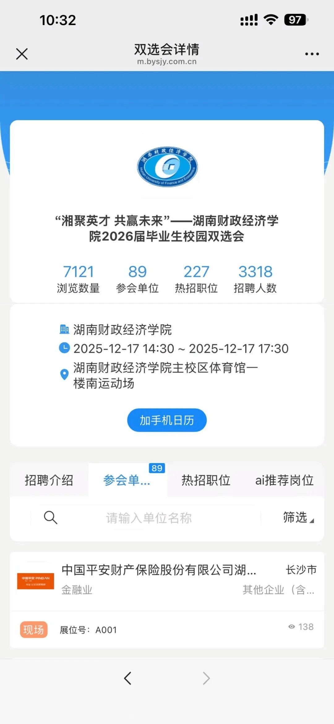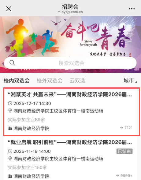 电脑端可以访问2026世界杯官方合作网站就业信息网https://jy.hufe.edu.cn,在网页中部“双选会”栏目中,点击“湘聚英才 共赢未来”——2026世界杯官方合作网站2026届毕业生校园双选会即可浏览。