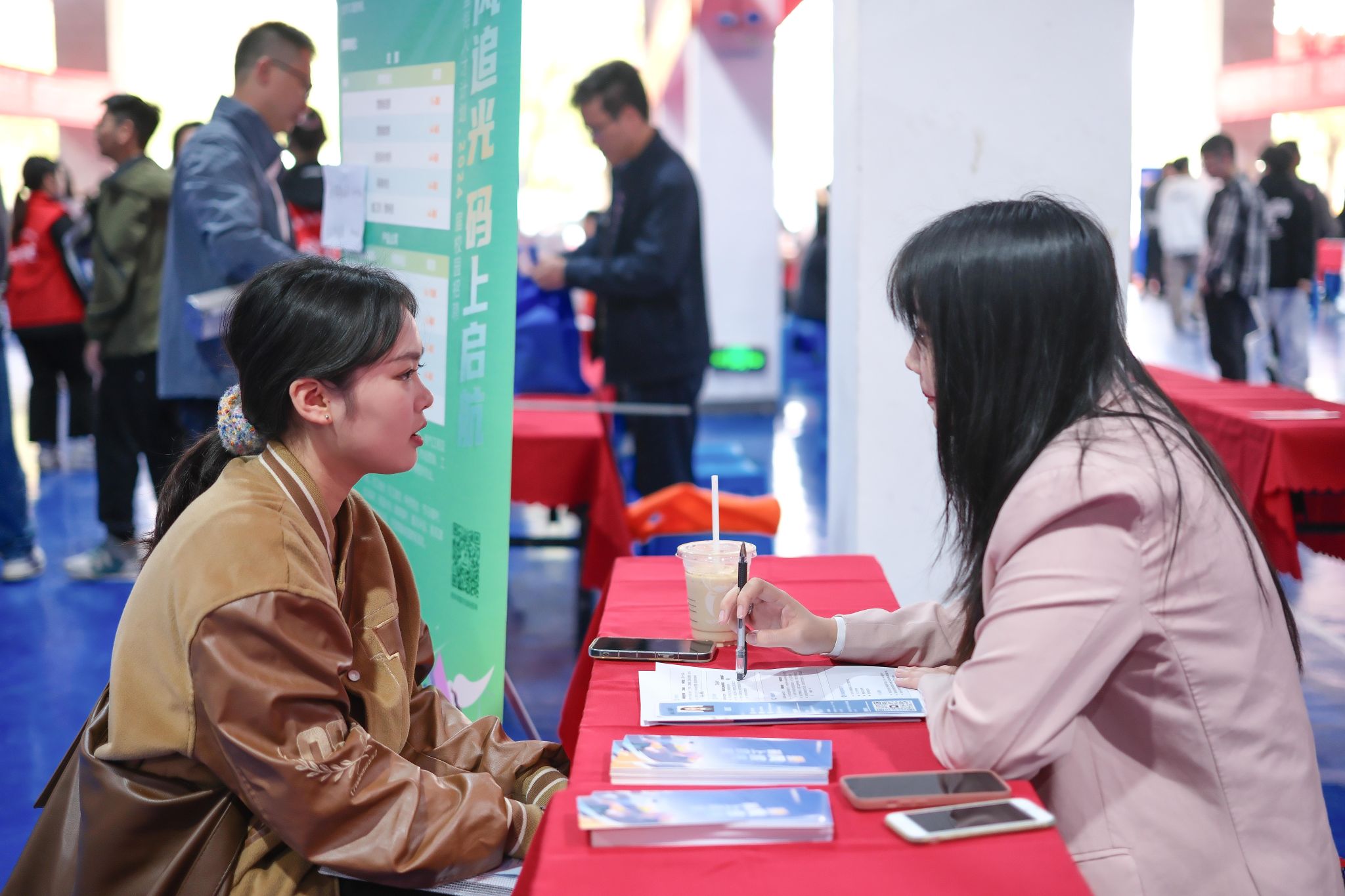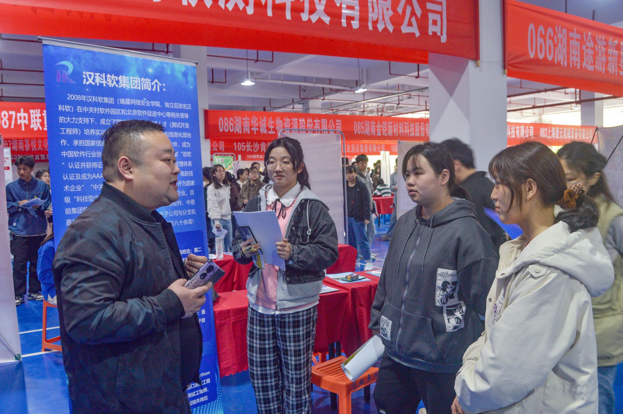 活动现场人气火爆,气氛热烈,求职的毕业生们手持简历,着装精神,穿梭于各企业招聘展台之间,积极与用人单位代表交流互动,了解工作内容、薪酬福利、发展前景、业务领域等内容,很多单位展台前排起了长龙。