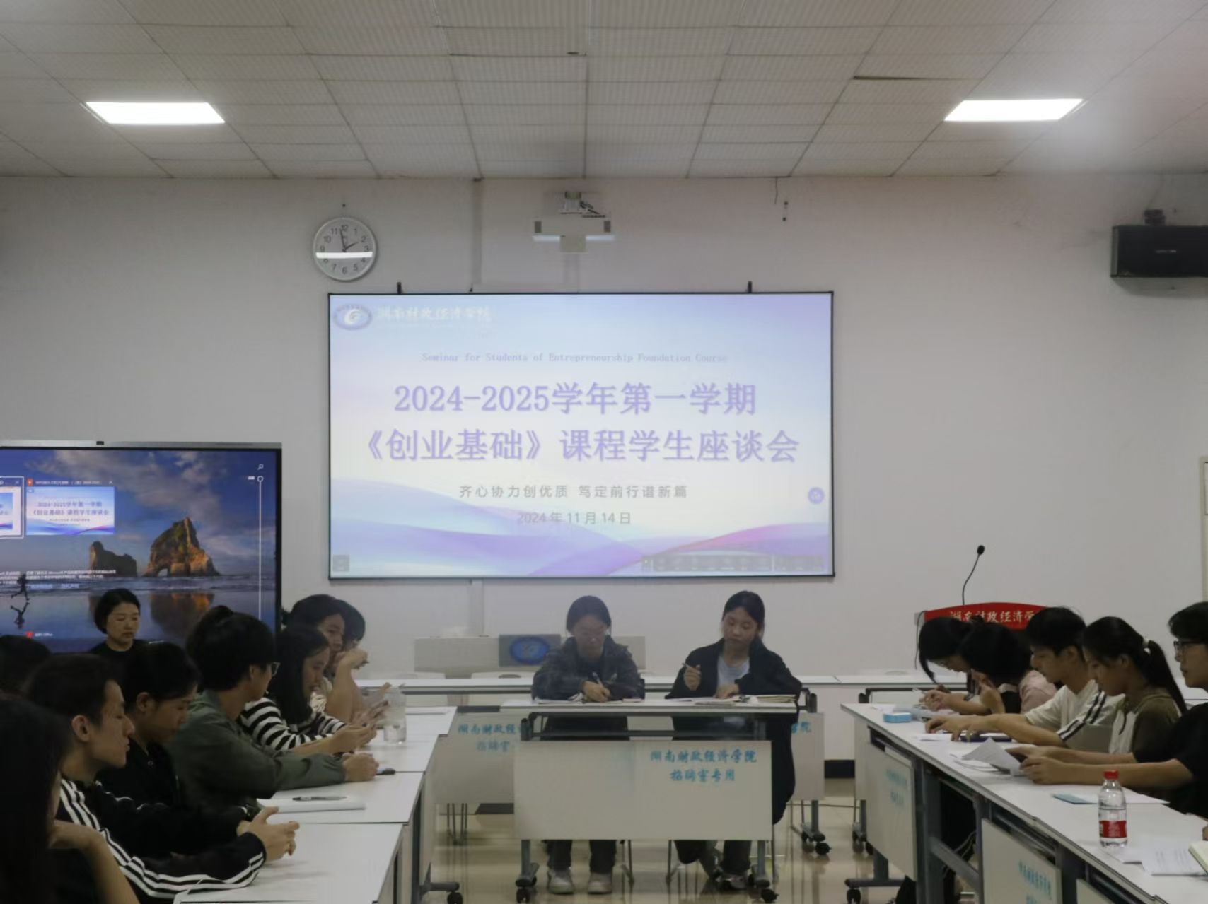 11月14日晚,世界杯官网就业创业中心在体育馆一楼多媒体招聘室召开了《创业基础》课程学生座谈会,会议由大学生创新创业指导教研室负责人周雪主持,2023级各班学生代表参会。