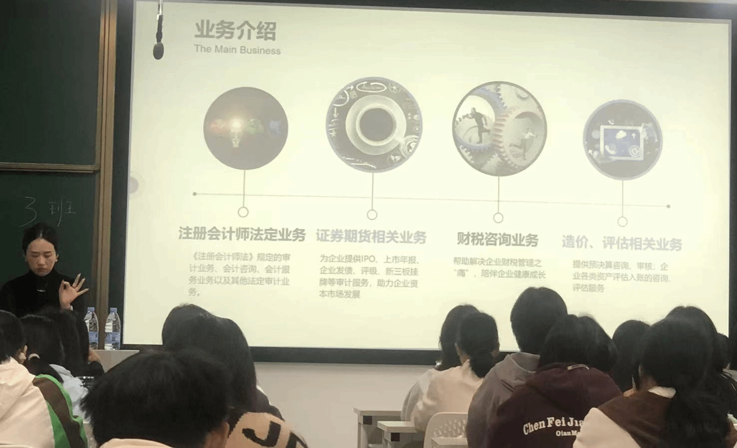 湖南分所成立于 2019 年,自开业以来已实现营业收入 6000 万元,缴纳税金 400 多万元,现有员工 100 多名。分所依托总所强大的资源优势和专业团队,在湖南区域深耕细作,为地方经济发展贡献专业力量。分享会上,主讲人详细介绍了事务所的发展历程、核心业务、团队构成及企业文化,让学子们对这家行业标杆企业有了全面认识。