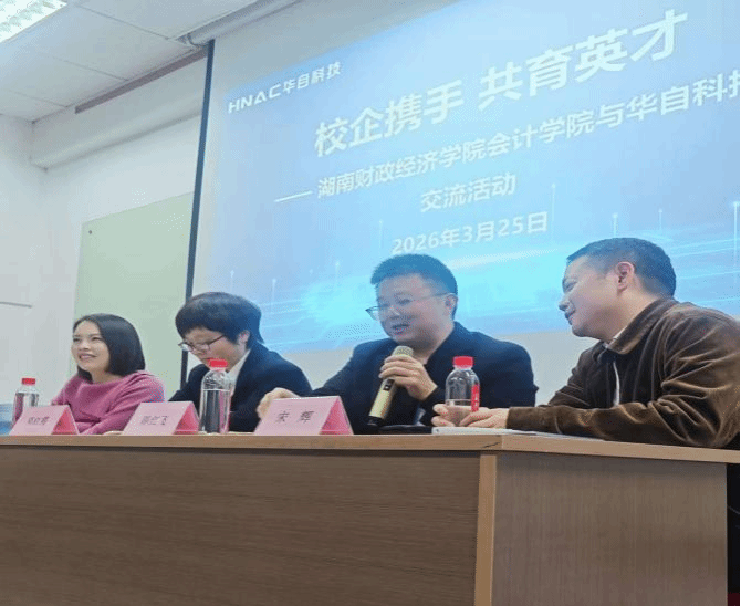 (本网讯)2026年3月25日,谢佩君老师及吴鹏老师带领2025级审计一班、审计二班共101名学生,走进华自科技股份有限公司(以下简称“华自科技”)开展实践教学活动。华自科技证券投资部部长卢志娟全程陪同参观并主持座谈。