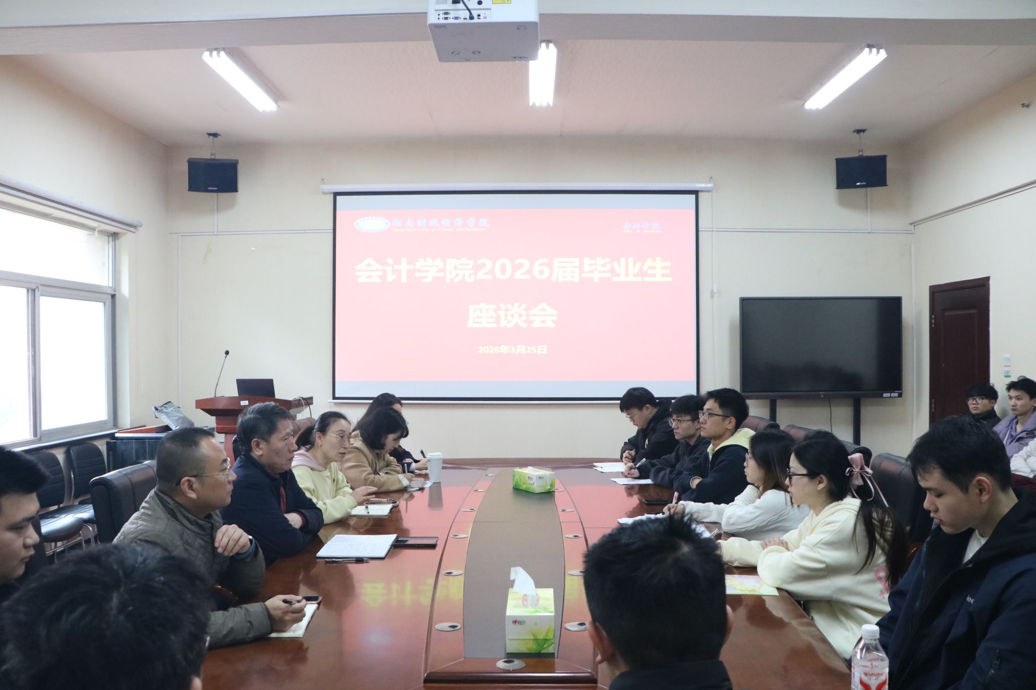 (本网讯)3月24日至26日,我院连续召开三场2026届毕业生就业工作系列推进会。会计学院党委书记戴恩湘、副书记肖芳全程出席,辅导员管超男、詹子露、胡旭、张繁及毕业生代表依次参会,会议由就业专干蔡益华主持。