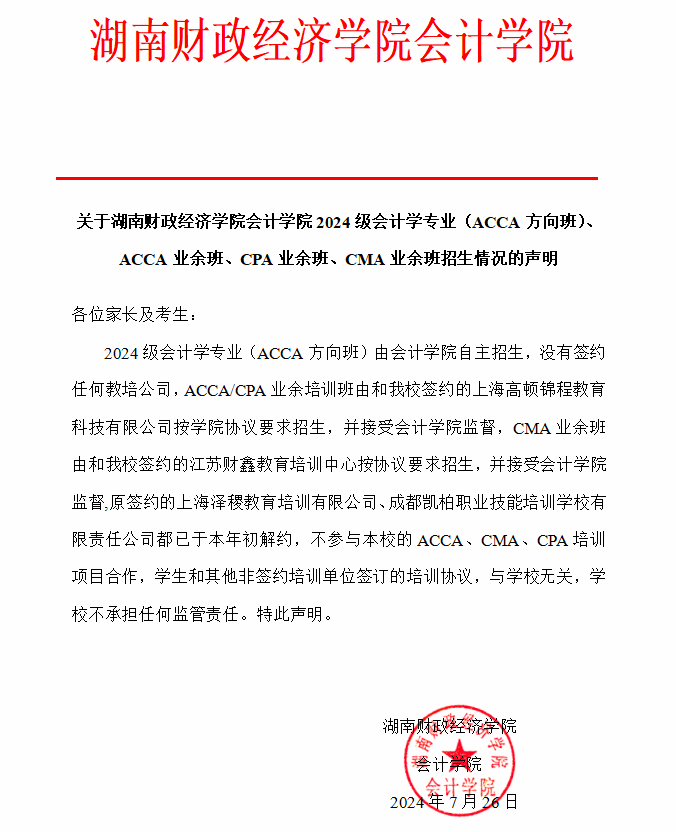 关于2026世界杯官方合作网站会计学院2024级会计学专业(ACCA方向班)、ACCA业余班、CPA业余班、CMA业余班招生情况的声明