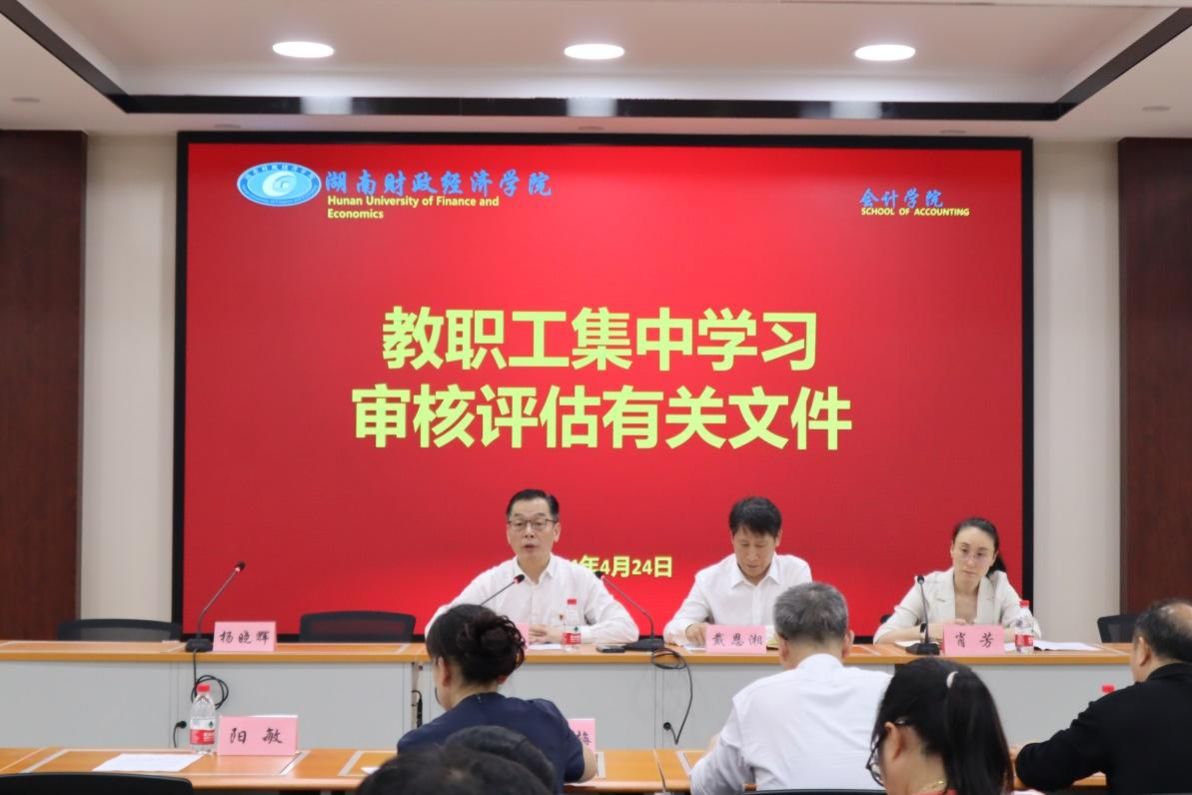 (本网讯)为深入贯彻学习党中央《深化新时代教育评价改革总体方案》和《关于深化新时代教育督导体制机制改革的意见》的文件精神,提高学校人才培养质量,4月24日下午2:30,会计学院组织全体教职工集中学习审核评估文件。