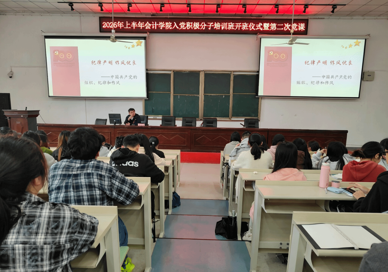 (本网讯)2026年4月14日中午,会计学院2026年上半年入党积极分子培训班第二次党课教育活动在第二教学楼2J01教室正式开展。会计学院入党积极分子参会,党课由教师第一党支部书记蔡晨光主讲。