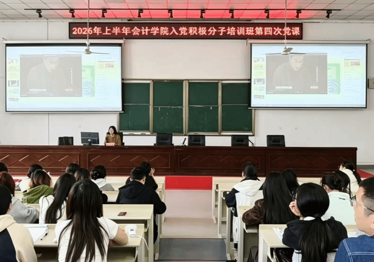 (本网讯)2026年4月17日中午,会计学院2026年上半年入党积极分子培训班第四次党课在第二教学楼2J01教室举行。本次课程由教师第二党支部书记粟金霞主讲,全体学员参加。
