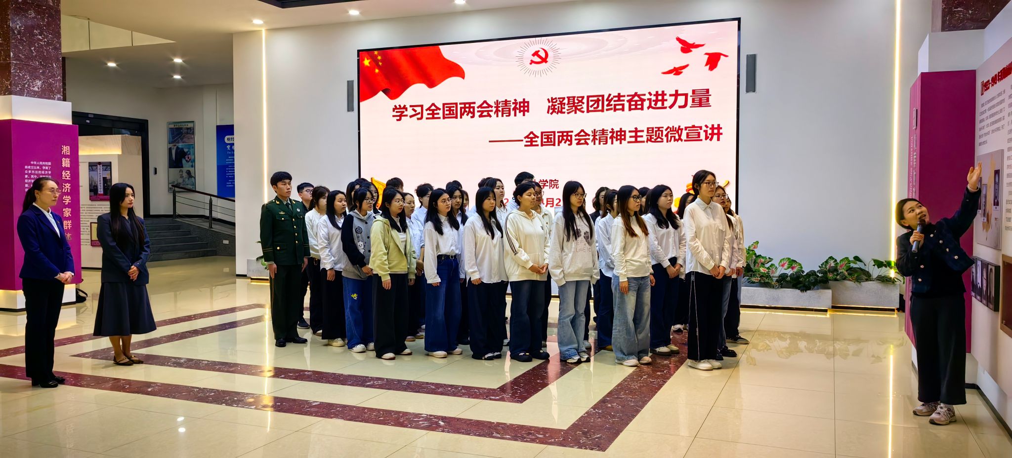 活动伊始,李敏带领大家参观厚生风华育人基地,通过生动讲解带领同学们感悟红色初心,筑牢思想根基。随后,学生代表依次领读全国两会要点摘编与党的二十届四中全会精神核心内容,带领大家逐字逐句领会会议精神,让理论学习入脑入心。