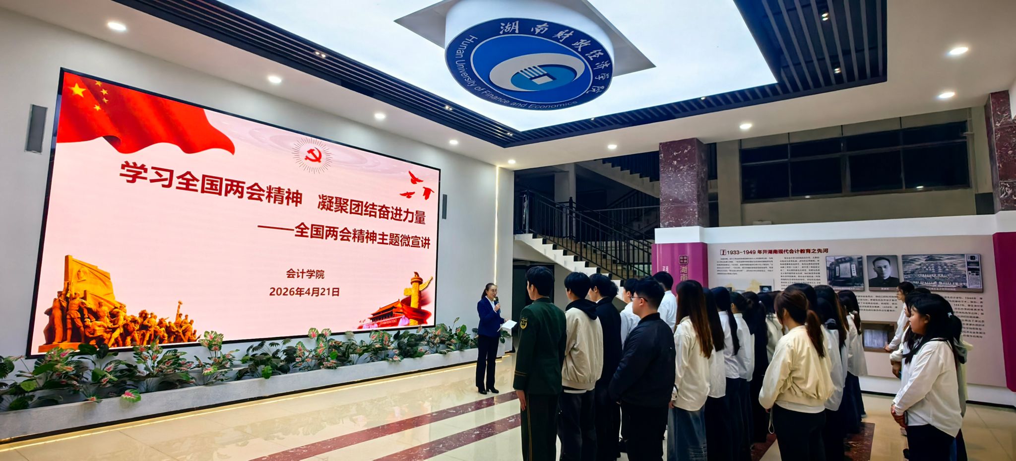 (本网讯)为深入学习贯彻2026年全国两会精神与党的二十届四中全会精神,引导青年学生将个人理想追求融入党和国家事业之中,4月21日中午,2026世界杯官方合作网站会计学院在厚生风华育人基地开展“学习全国两会精神 凝聚团结奋进力量”主题微宣讲活动。院党委副书记肖芳、学工办主任蔡益华、院团总支书记管超男、师生联合党支部书记李敏及团学会全体学生参与本次活动。